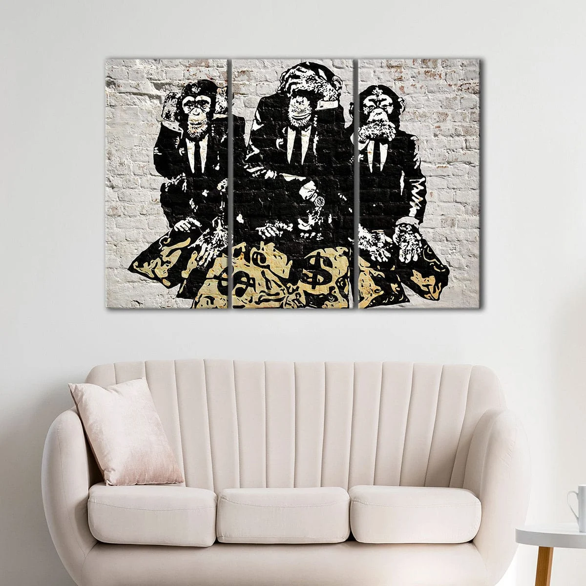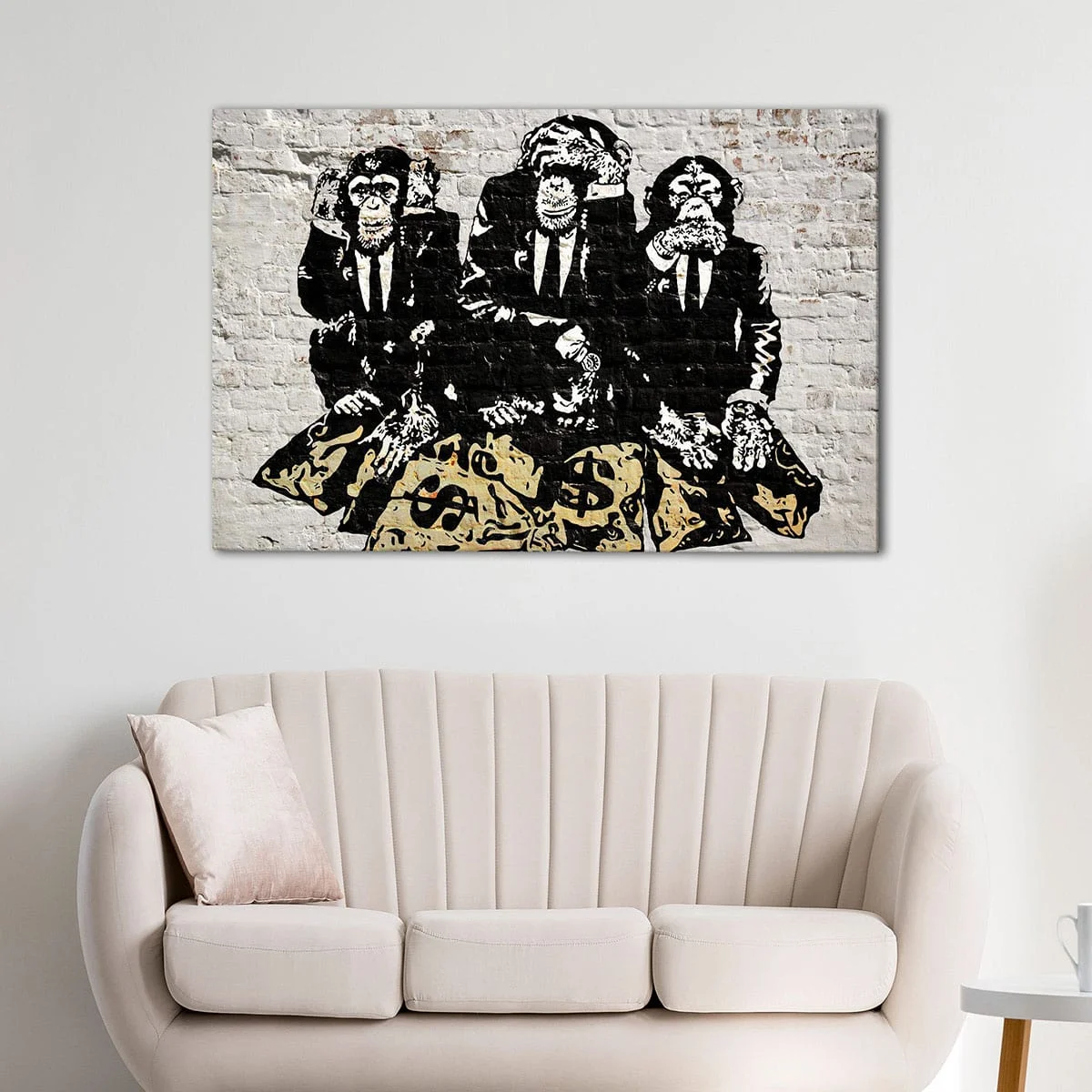This beautiful Banksy 3 Wise Monkeys canvas art is expertly crafted for a high-quality presentation. The 100% natural wood stretcher bars are carefully hand-stretched to provide a sturdy and long-lasting canvas. The premium poly-cotton canvas and pigment-archival inks ensure vivid colors that will remain for over 100 years.
