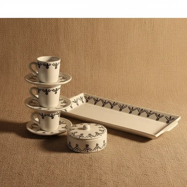 Each piece showcases the distinctive character of handcrafted pottery, featuring unique textures and earthy tones that reflect centuries-old Berber traditions. The versatile rectangular tray provides ample serving space, while the lidded candy dish adds functionality for presenting sweets or sugar alongside your coffee service. Create memorable moments with this stunning tableware that blends cultural heritage with everyday practicality.