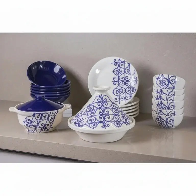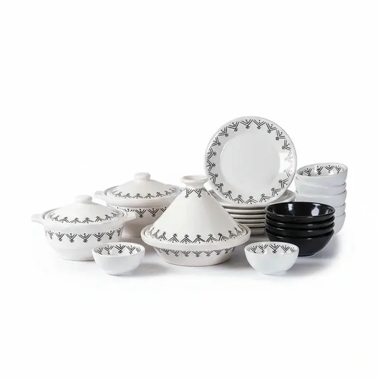 Experience the rich heritage of Tunisia with our Amazigh 22-piece pottery dinnerware set. This exquisite collection celebrates traditional Berber artistry, bringing authentic cultural elegance to your dining table. Each piece is carefully crafted using time-honored pottery techniques, creating tableware that is both beautiful and functional.