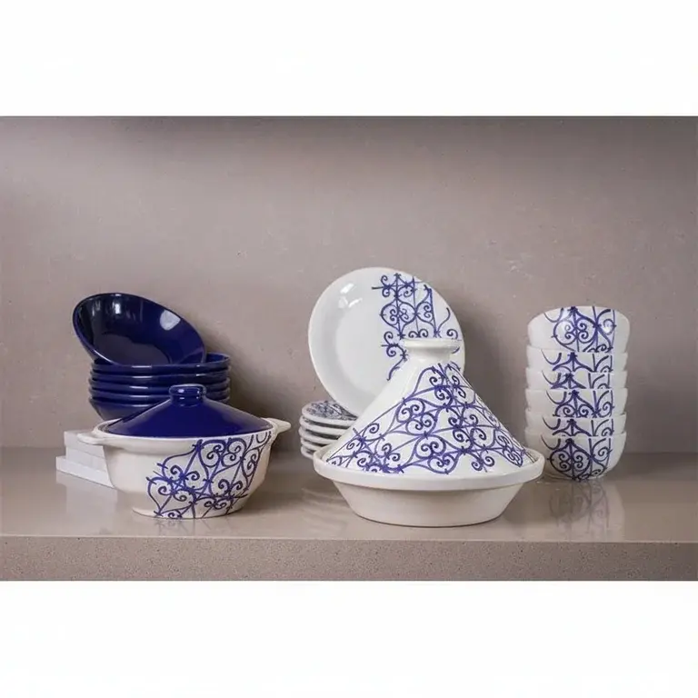 This comprehensive set includes everything you need for elegant dining: 6 versatile bowls, 6 deep plates for hearty meals, 6 flat plates for everyday use, 1 generous soup tureen, 1 traditional tagine pot, and 2 practical lids. The perfect ensemble for family dinners or entertaining guests with style and cultural authenticity.