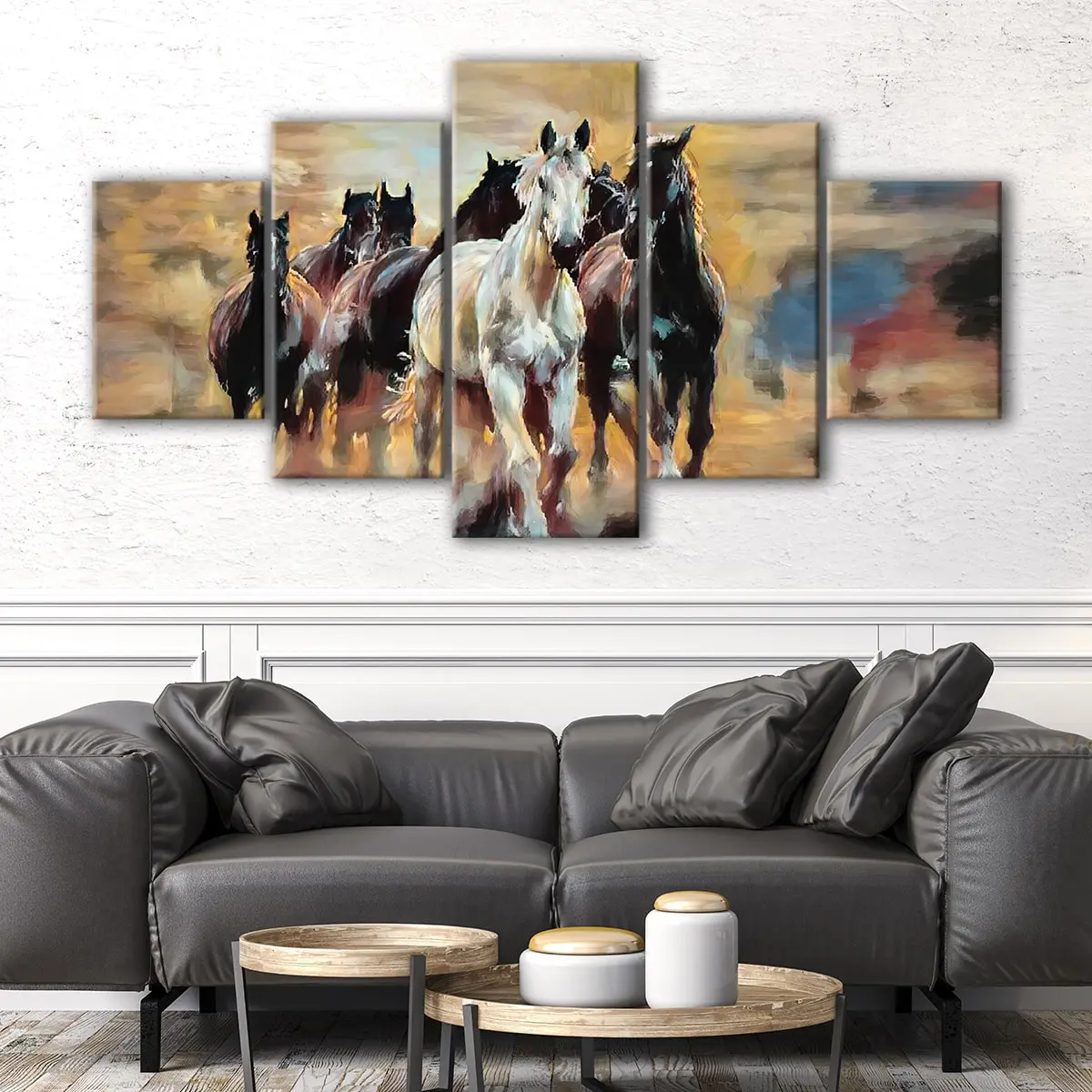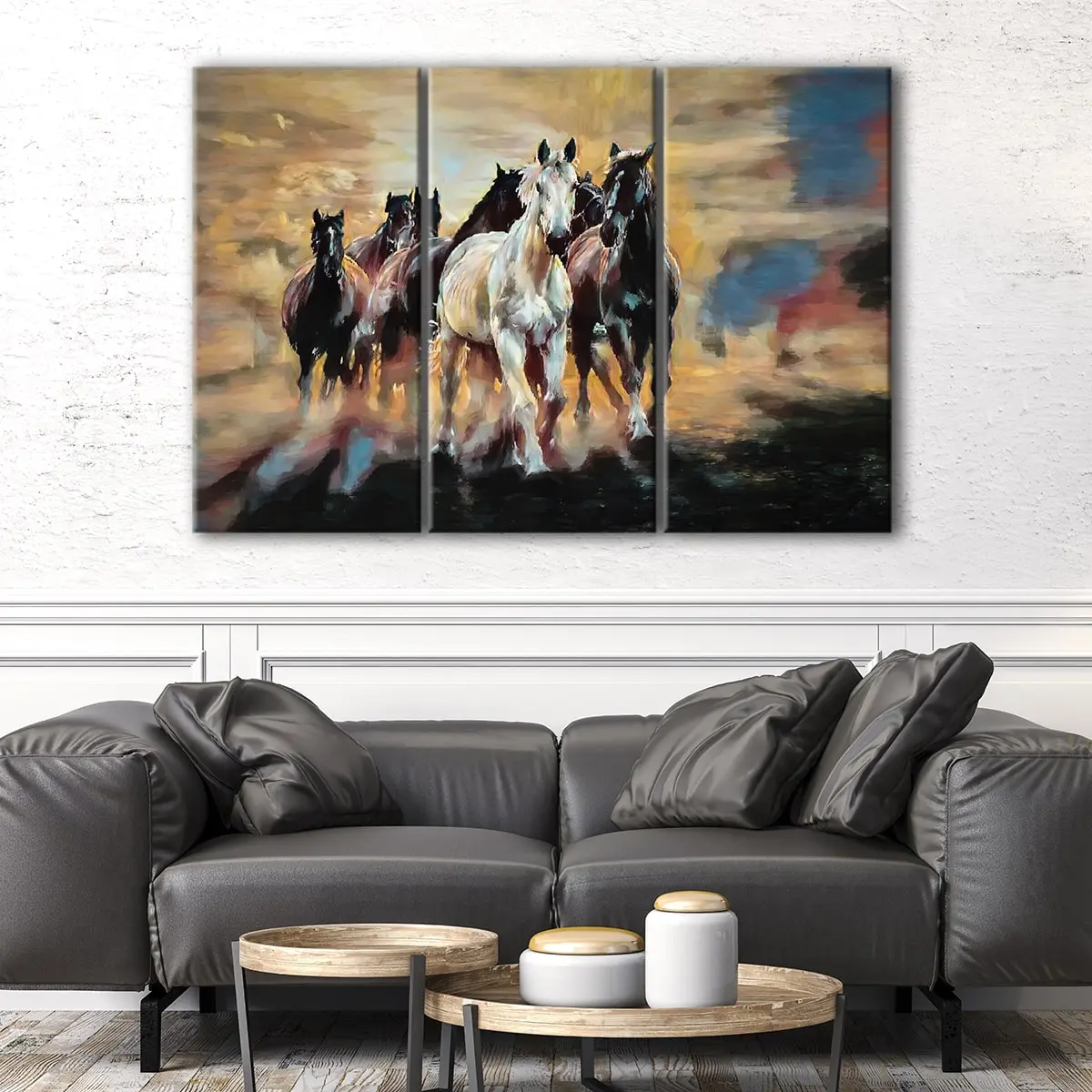 This stunning running horses wall art is available in 1 panel, 3 panels, or 5 panels to suit any room in your home. Choose from a wide range of sizes, from small to oversized, to find the perfect fit for your living room, hallway, kids room, or dining room. Our art adds a touch of elegance and beauty to any space.