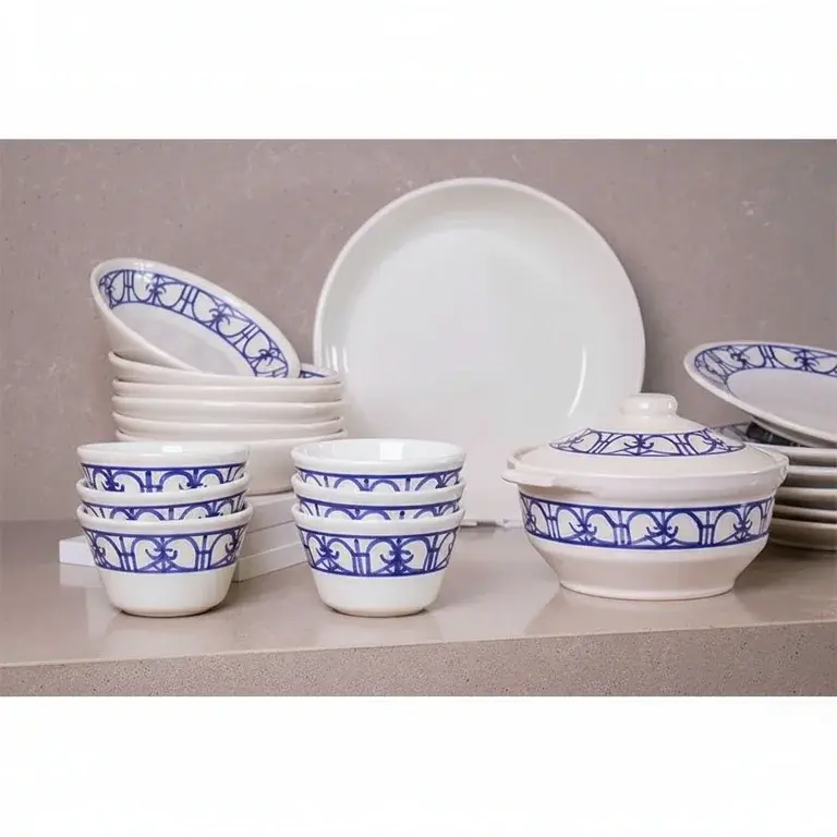 The set includes 6 bowls, 6 deep plates, 6 flat plates, 1 soup tureen, 1 large couscous platter, and 1 lid. Each piece showcases elegant blue patterns artfully drawn on a brilliant white ceramic base. This design adds a touch of traditional charm while enhancing the ceramic's natural shine, creating a perfect blend of heritage and contemporary style.