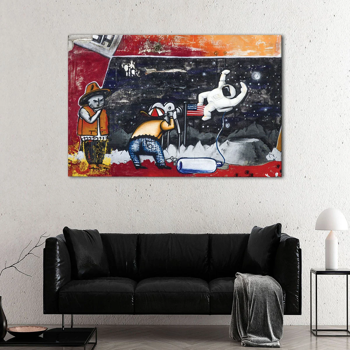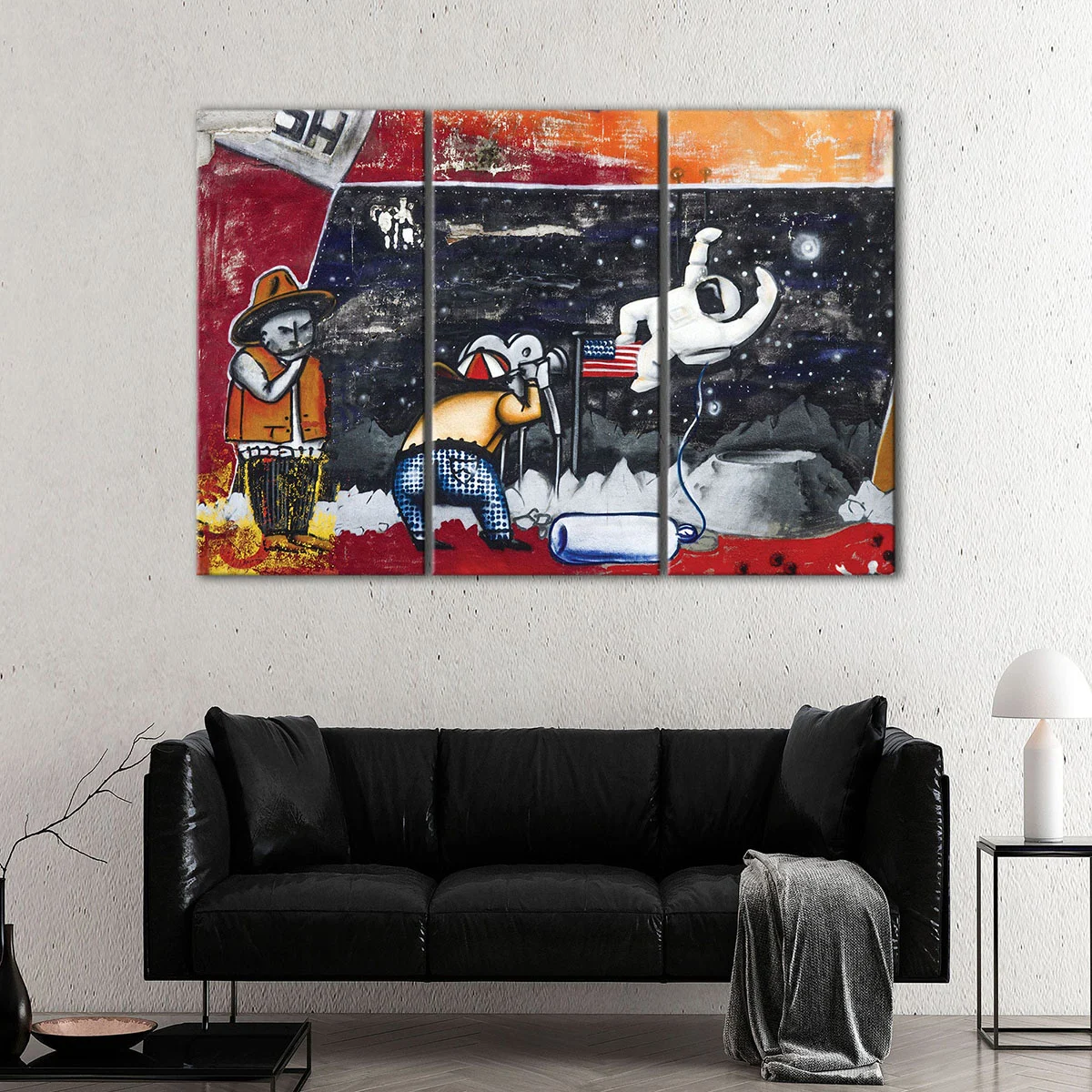 A high-quality, ready-to-hang Astronaut Graffiti canvas art, hand-stretched over natural wood stretcher bars by our expert craftsmen. Available in 1, 3, or 5-panel set, and a variety of sizes, from small to oversized.