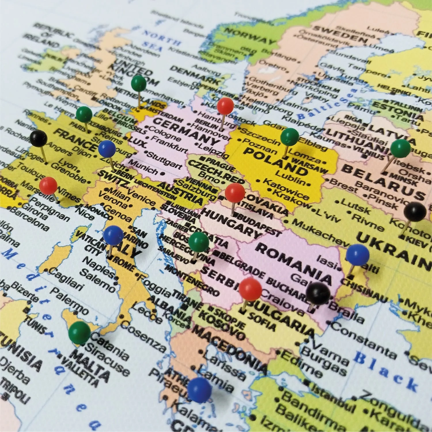 Your map comes with 200 push pins of 4 different colors: 50 pins of each color.