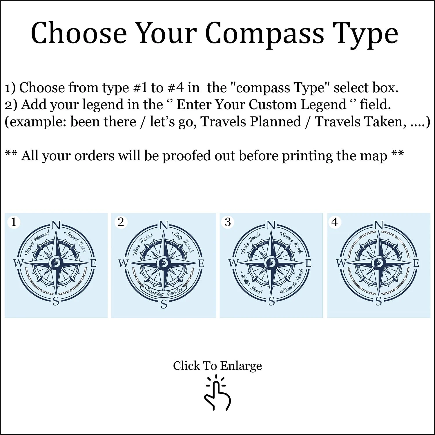 The travel legend is incorporated inside the compass (see product images). You can choose from 4 compass types, depending on how many elements you want to include in the legend. The default legend text is: Travel Planned / Travel Taken; but you can change it to your preference. Here are a few Examples: ”been there /let’s go” “Past Adventures / Next Adventures” “Bryan Trips / Katy Trips / Together” , etc…. Simply add your customized legend text request in the “Enter Your Custom Legend” field.