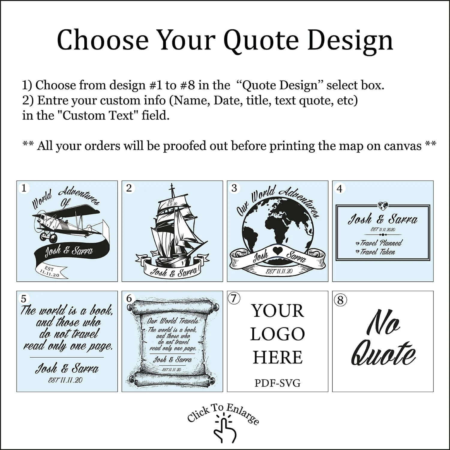 We love personalizing your map! Choose from 7 Quote & Title styles (Anchor, ship, balloon, aircraft, etc…). If you choose option 6 or 7, we will provide you with 20 hand-picked travel quotes to help you find a the quote that speaks to you! You can also remove the title & quote if you want a simple map design. Just choose option #8: NO QUOTE in the “Quote Design” select box. Already have a travel quote in mind? Just, write it down in the ”Enter Your Custom Text” field, and we will incorporate it into your map.