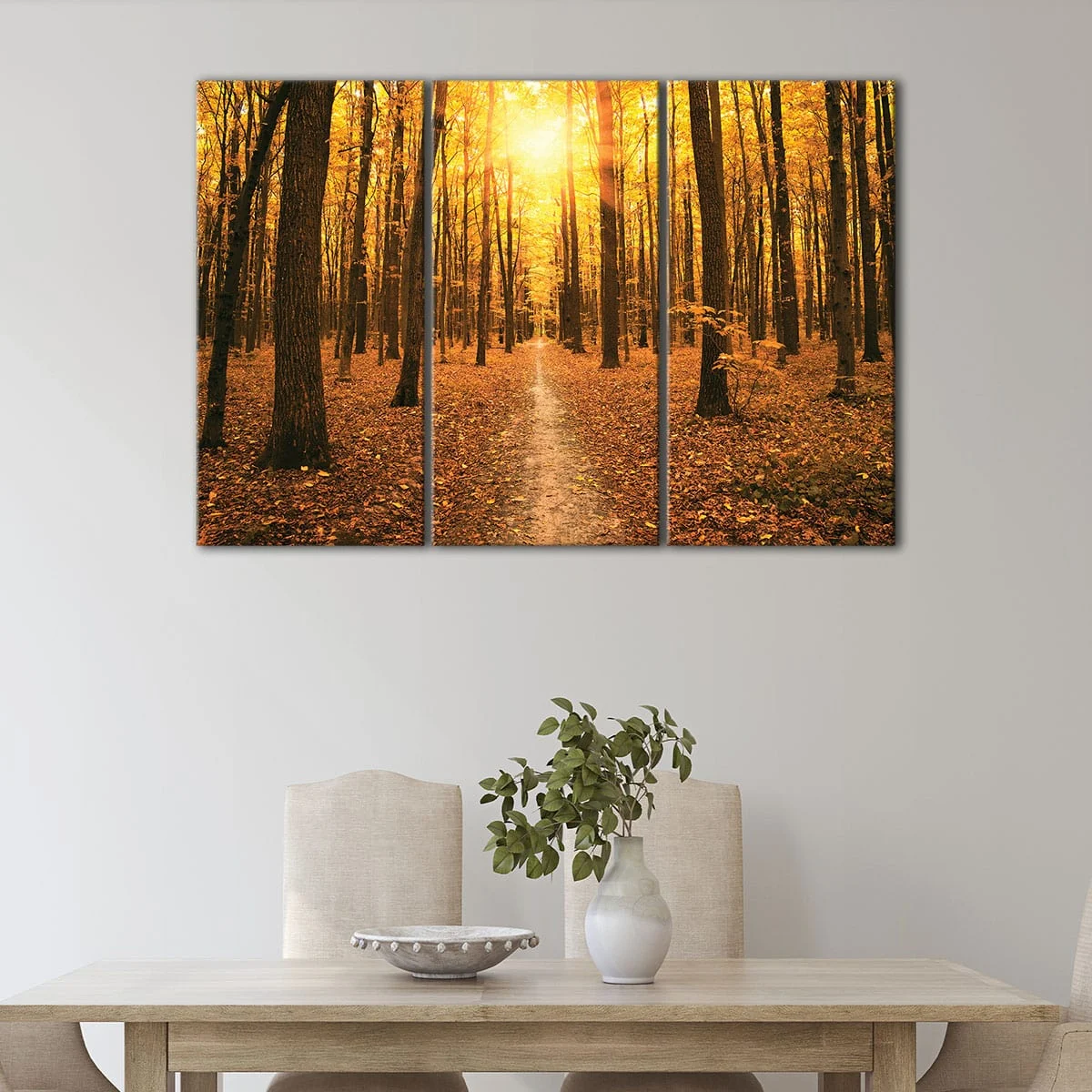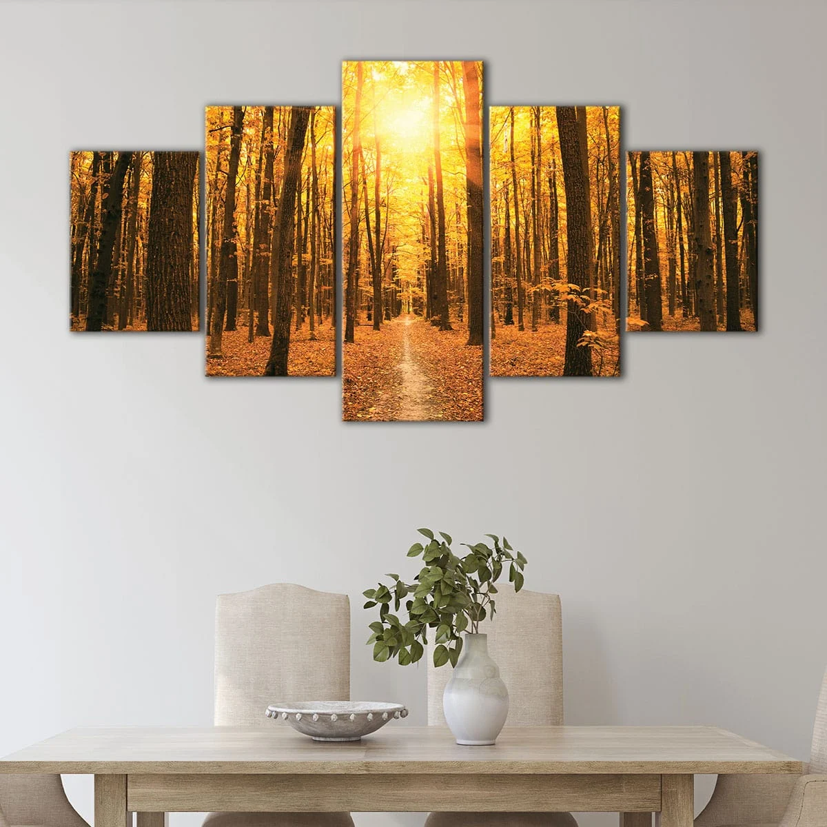 This autumn forest sunset wall art is available in various options to suit your taste and space. Choose between 1 panel, 3 panels, or 5 panels, and select from multiple sizes to fit your living room, hallway, kids' room, or dining room.