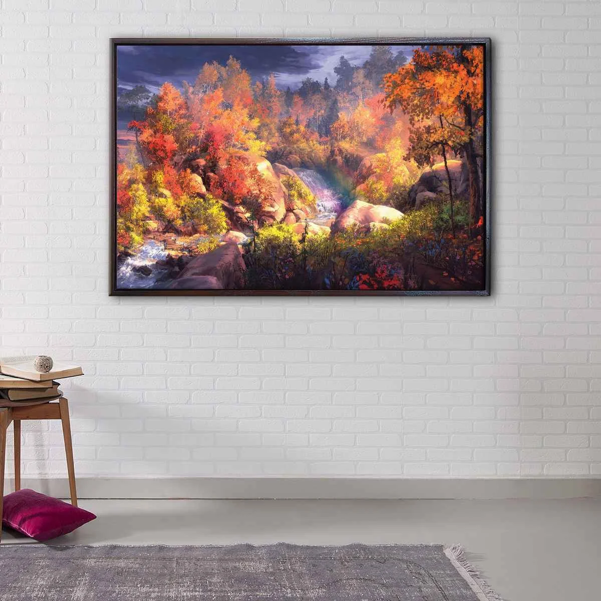 Our Autumn Landscape artwork comes ready-to-hang with metal saw-tooth hangers on the back, so no additional framing is required. It is artistically crafted to create a truly immersive experience, transport yourself to a serene autumn forest scene that will captivate your senses.