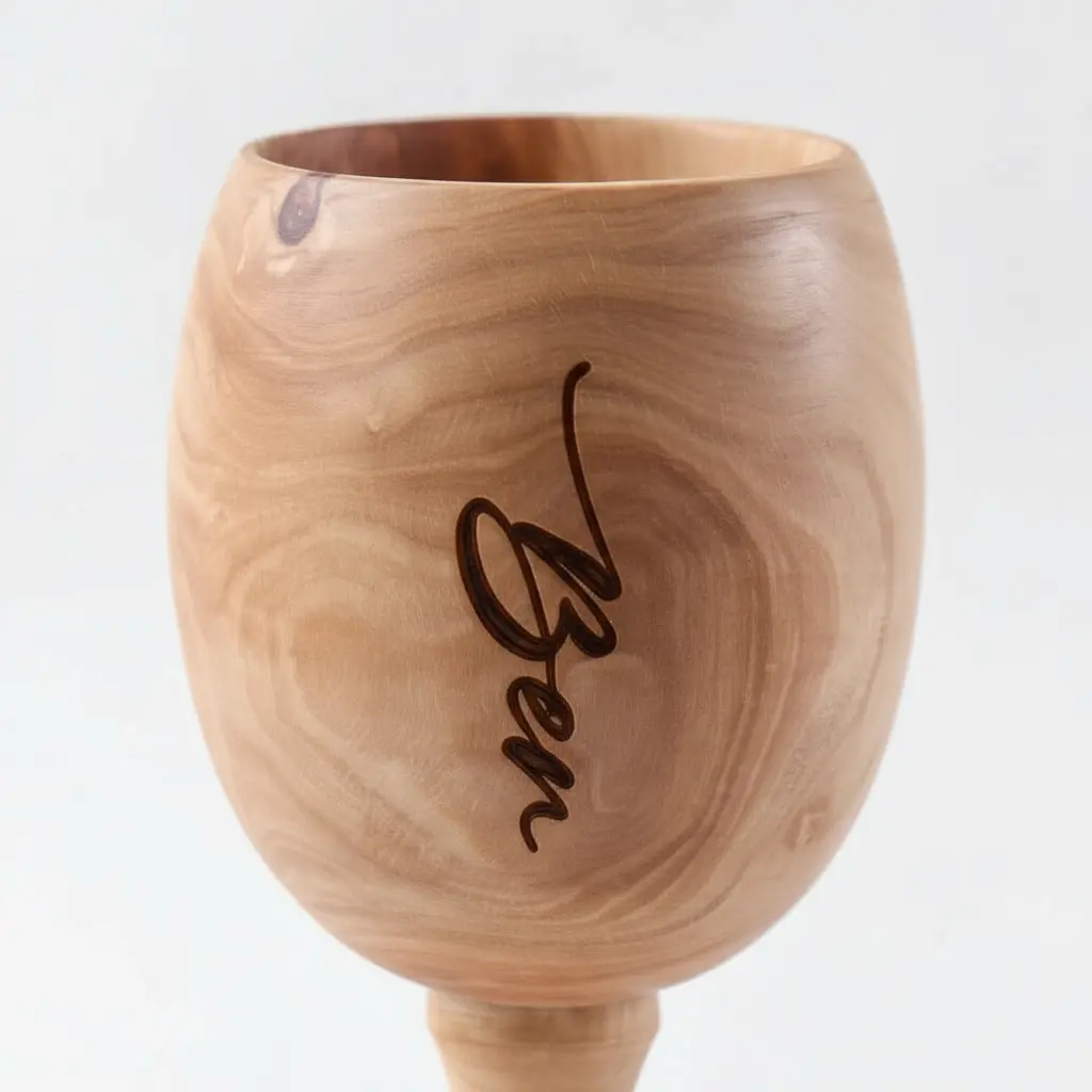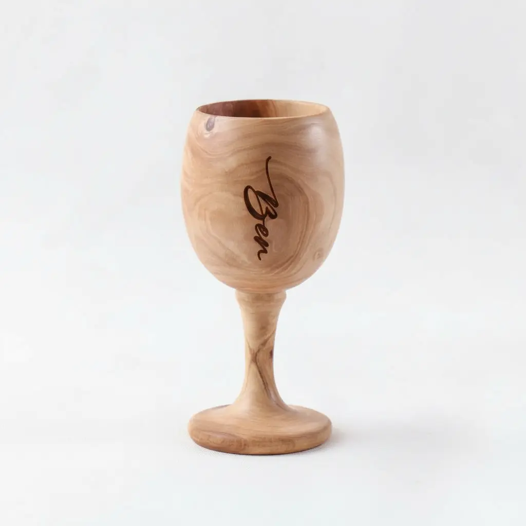 Discover the 'Ben' Olive Wood Goblet, a unique piece of stemware that showcases exceptional artisanal craftsmanship. Each goblet, also known as a chalice, is meticulously carved from solid olive wood, ensuring no two pieces are exactly alike. The natural wood grain patterns create a beautiful, organic aesthetic that brings warmth and rustic elegance to any table setting. This durable and sustainable piece is not only functional but also a work of art for your home.