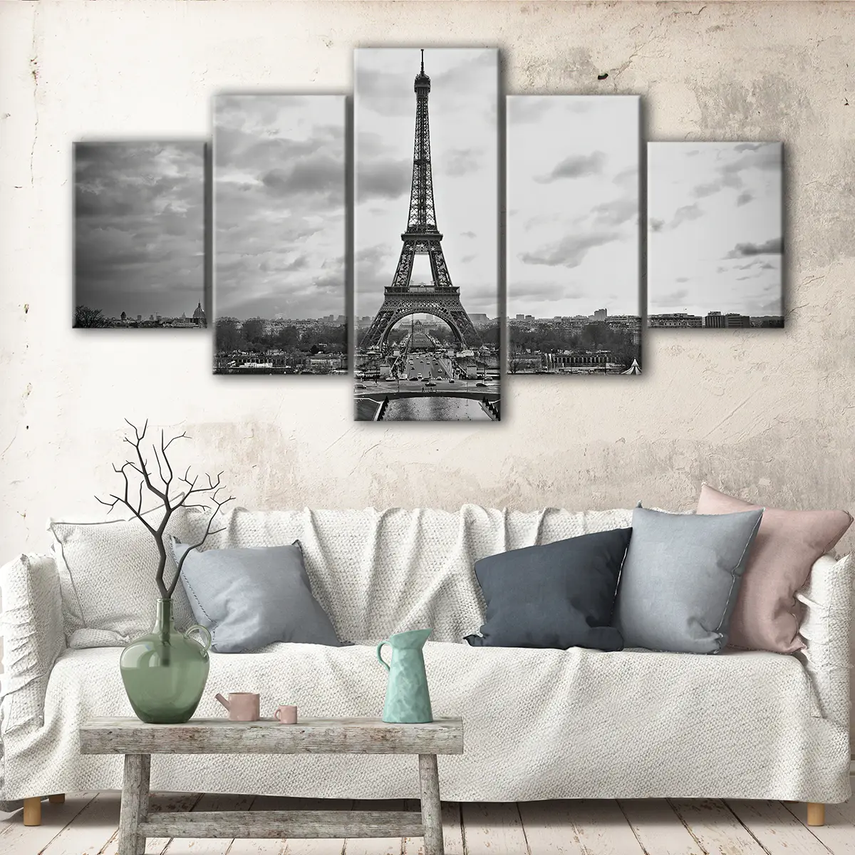 This Eiffel Tower wall art is available in multiple options: 1 panel, 3 panels, or a 5-panel masterpiece. Our prints come in a range of sizes: from small to oversized, ensuring it can fit seamlessly into your living room, hallway, kids' room, or dining room.