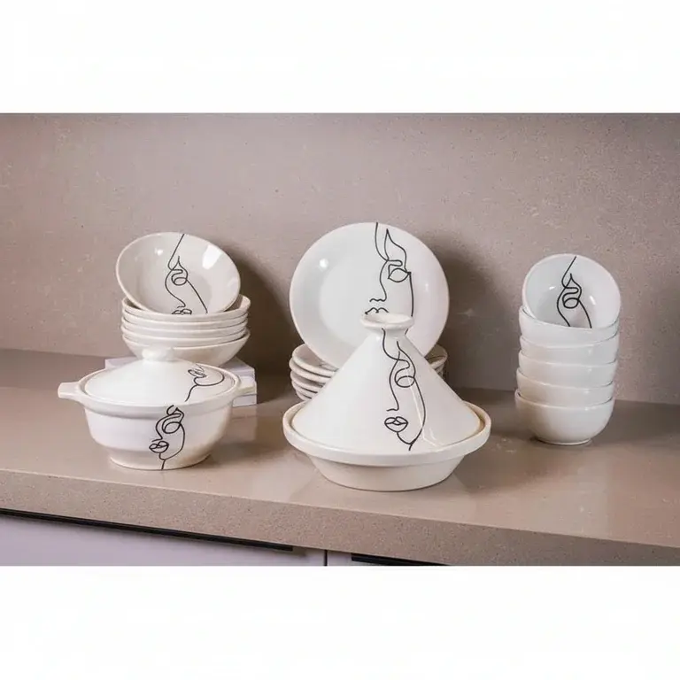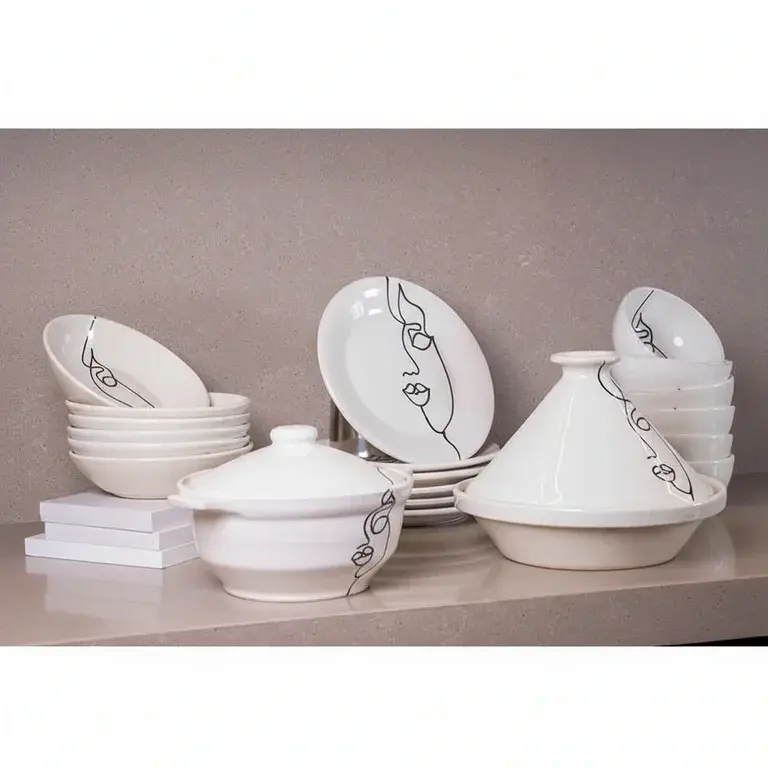 This comprehensive dinnerware collection includes everything you need for elegant dining: 6 bowls perfect for soups and cereals, 6 soup plates for hearty meals, 6 dinner plates for main courses, 1 spacious soup tureen for serving, 1 traditional tagine for authentic cooking and presentation, and 2 matching lids to complete the set. Each piece is carefully crafted from high-quality pottery, ensuring durability and timeless beauty that will enhance your dining experience for years to come.