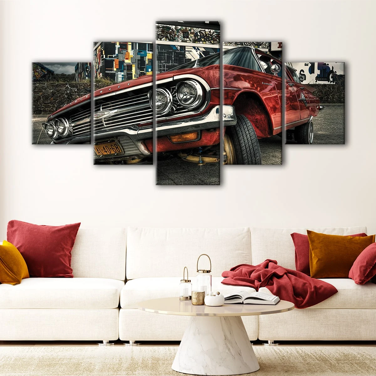This stunning red classic car wall art is available in various options to fit your space:
