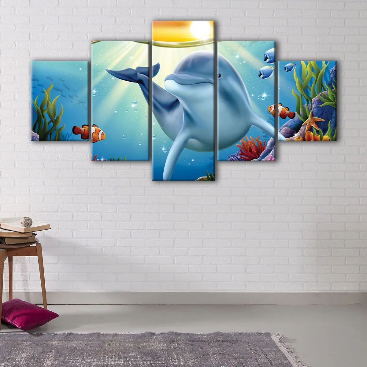 We offer this stunning cartoon dolphin wall art in a variety of sizes: • 1 panel for a sleek, modern look • 3 panels for a fun, playful feel • 5 panels for a dramatic, eye-catching statement • You can choose the perfect size to fit your unique space and style