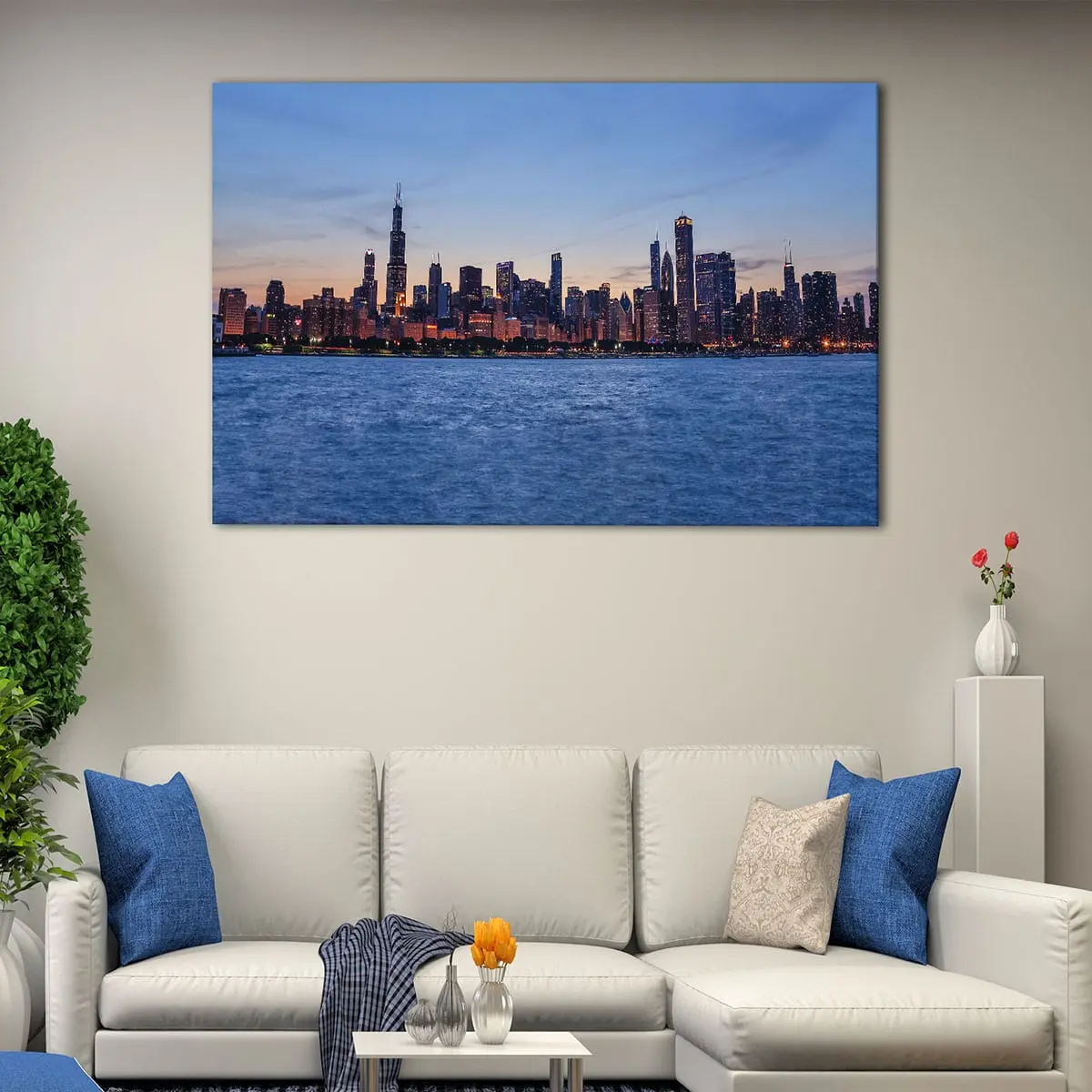 Our Chicago Skyline canvas art comes ready-to-hang with metal saw-tooth hangers on the back, requiring no additional framing. The canvas is carefully hand-stretched over 100% natural wood stretcher bars by our expert craftsman. We combine premium poly-cotton canvas with pigment-archival inks to offer high-definition prints with vivid colors that last for 100+ years.