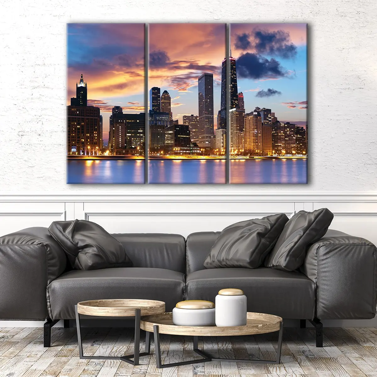 Our Chicago twilight skyline canvas art is meticulously crafted to bring you a stunning piece of cityscape artistry. This beautiful canvas comes ready-to-hang with metal saw-tooth hangers on the back, eliminating the need for any additional framing. Our expert craftsmen carefully hand-stretch 100% natural wood stretcher bars over premium poly-cotton canvas to ensure a high-quality print that will last for generations.