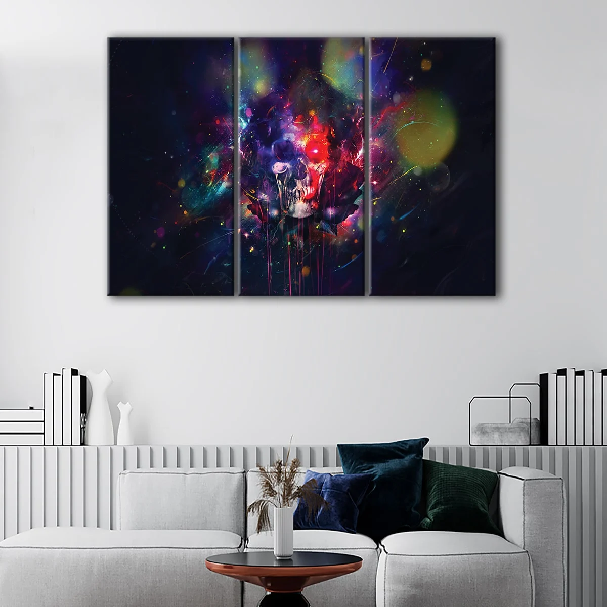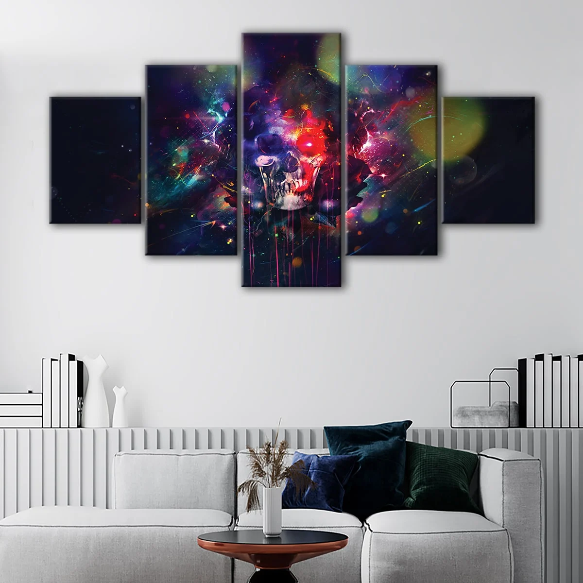 This abstract skull wall art is available in various options to suit your needs. Choose from a single panel or group them together in 3 panels, 5 panels, or any other size that fits your space. With sizes ranging from small to oversized canvas prints, it's perfect for your living room, hallway, kids' room, or dining room.