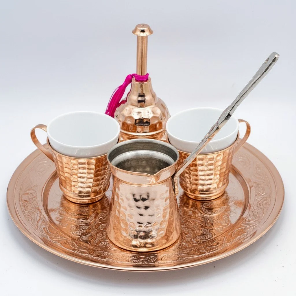 The set includes two beautifully crafted coffee cups made from fine porcelain adorned with elegant copper accents, offering a perfect balance of delicate beauty and durability. Accompanying the cups is a stunning copper 'mrach,' a traditional coffee pot, designed for both style and practicality. The warm glow of the copper complements the classic white porcelain, creating a visually harmonious and luxurious ensemble that is as much a decor piece as it is functional drinkware.