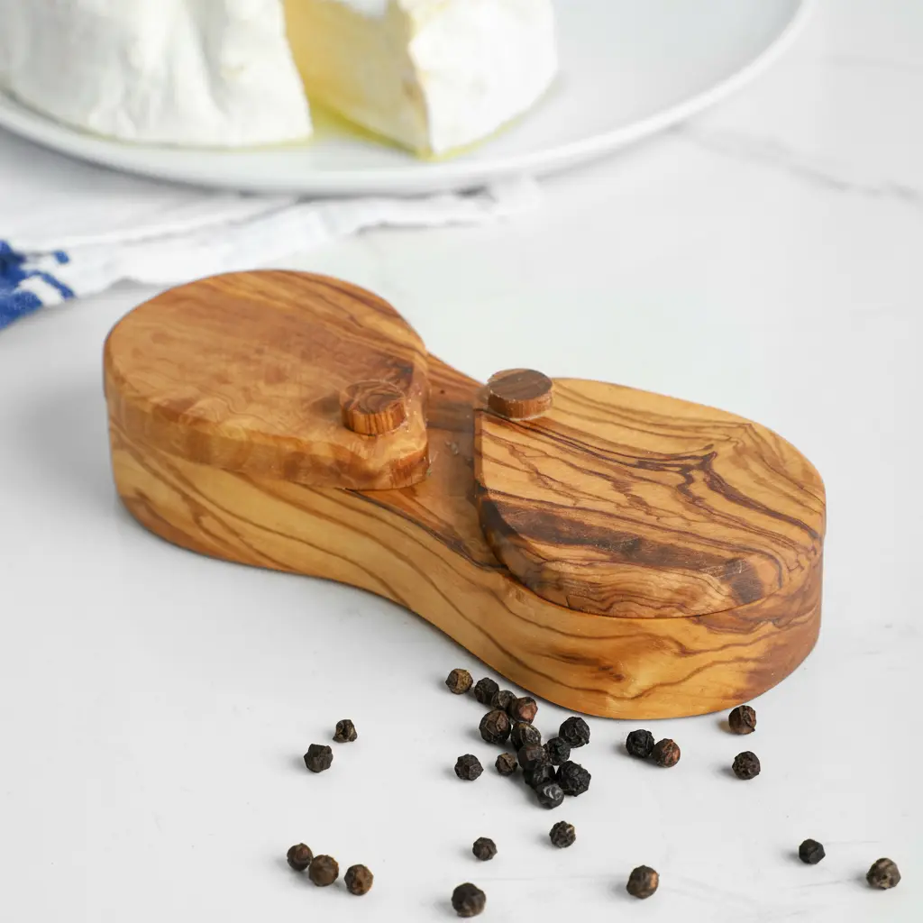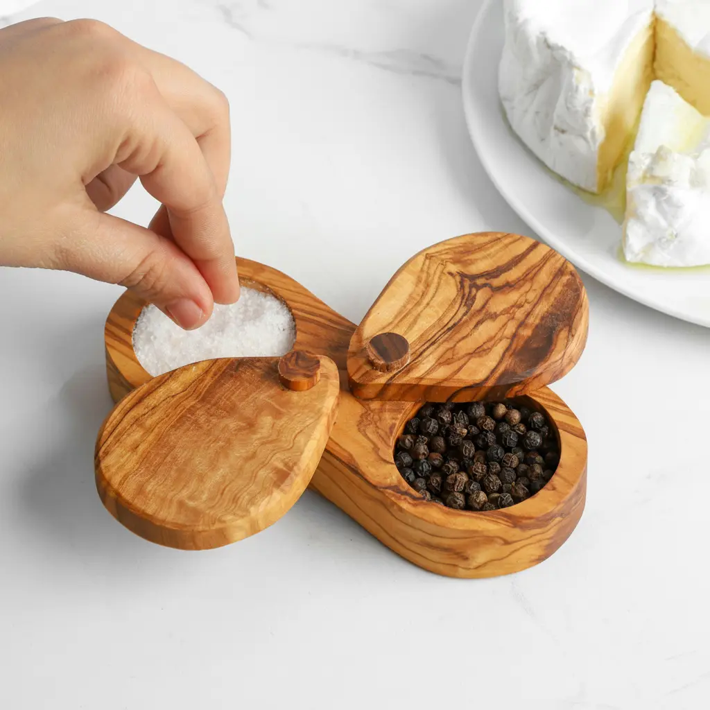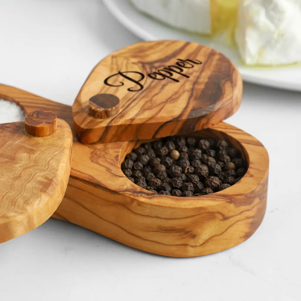 Discover the perfect blend of functionality and rustic elegance with our handmade olive wood salt cellar. This beautiful kitchen utensil features a unique double-compartment design with a fitted lid, making it ideal for organizing different types of salts, spices, or seasonings. Crafted from natural olive wood, each piece showcases the wood's distinctive grain patterns and warm tones, ensuring no two cellars are exactly alike. The smooth, polished finish enhances the wood's natural beauty while providing a comfortable grip.