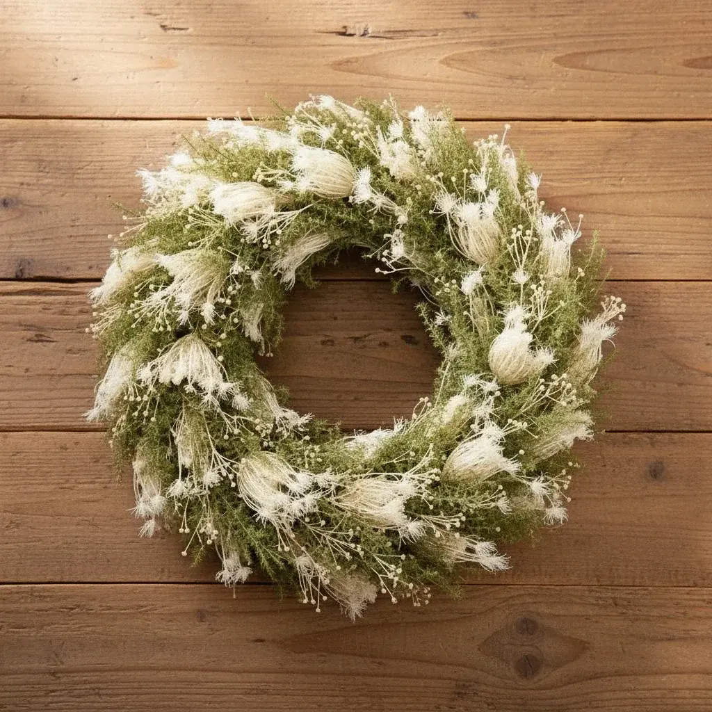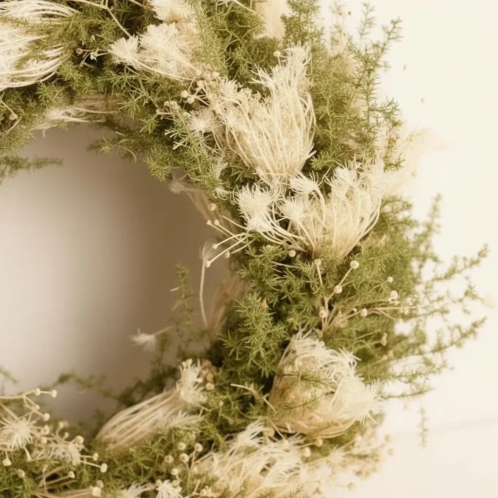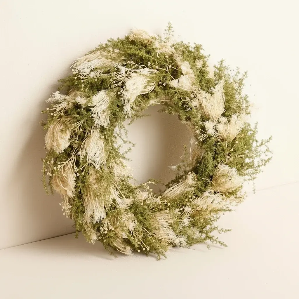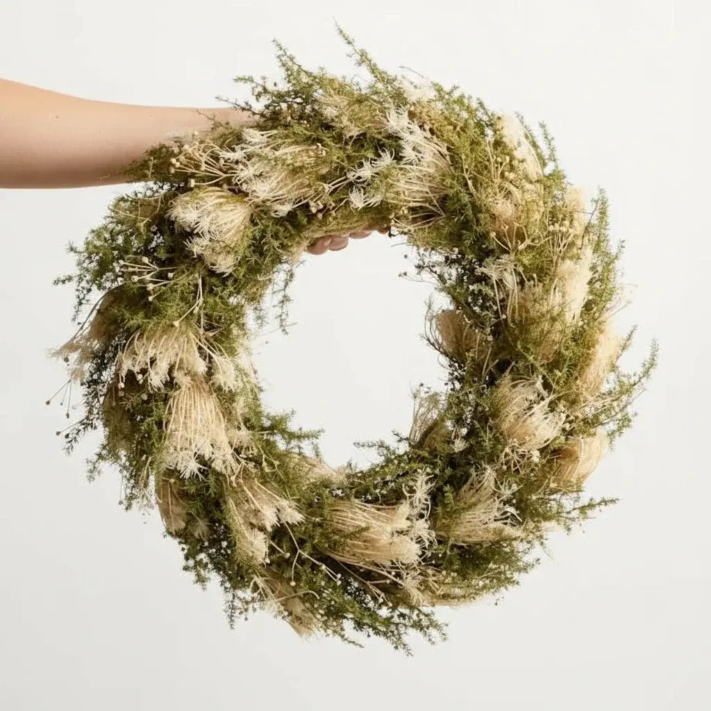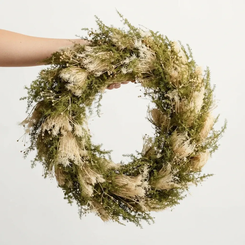 Each wreath is a unique work of art, featuring carefully selected dried flowers and natural materials that retain their color and form. The wild, organic arrangement evokes meadow-fresh beauty while requiring zero maintenance. No watering, no wilting – just continuous natural elegance. The durable construction ensures your wreath remains a focal point through seasons, making it a sustainable choice for eco-conscious decorators.