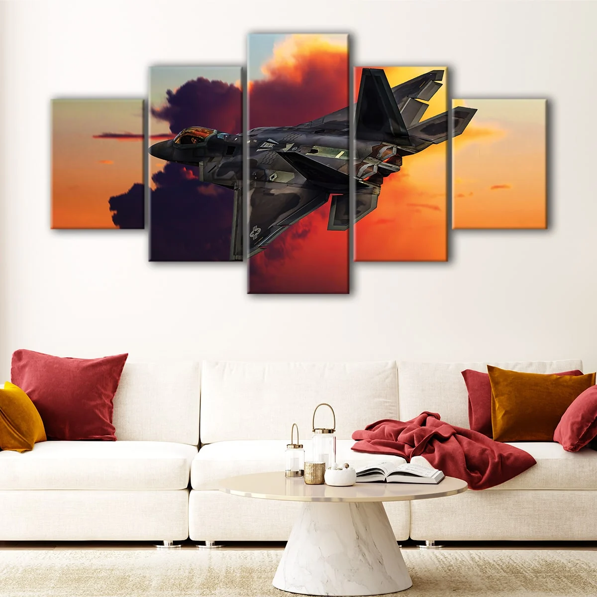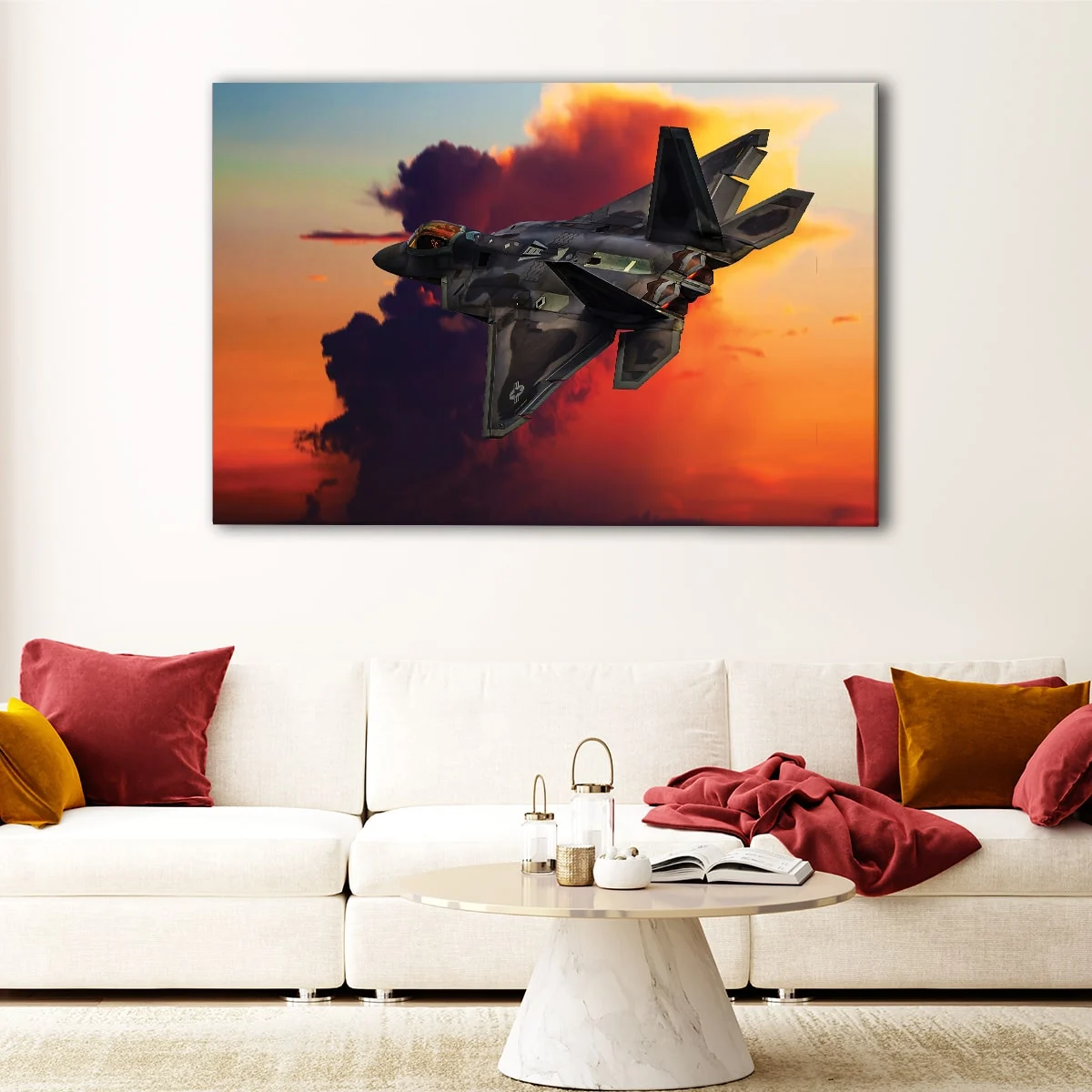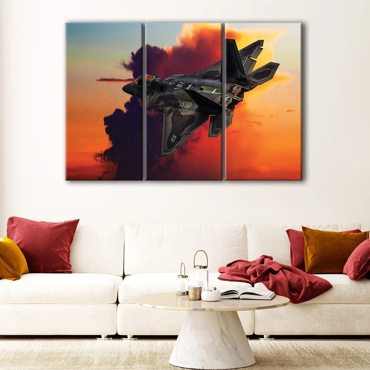 Fighting Jet Wall Decor for years to comeThis breathtaking military aircraft artwork is perfect for any room in your home, from a small canvas print to an oversized edition. The various options include a single-panel, 3-panel, or 5-panel canvas print, and is available in a range of sizes to fit any space.