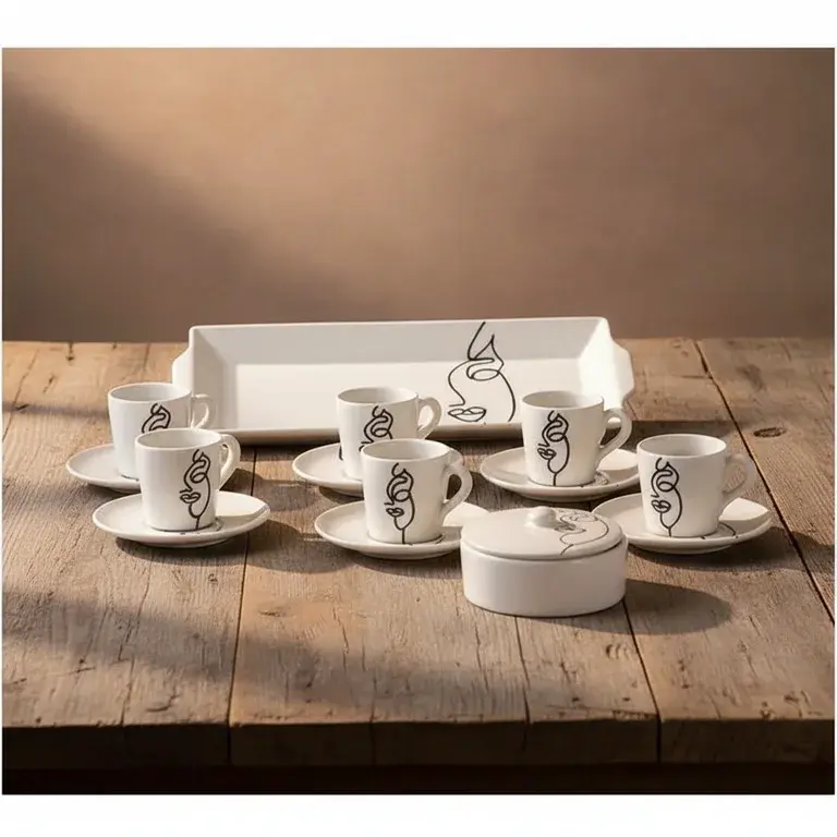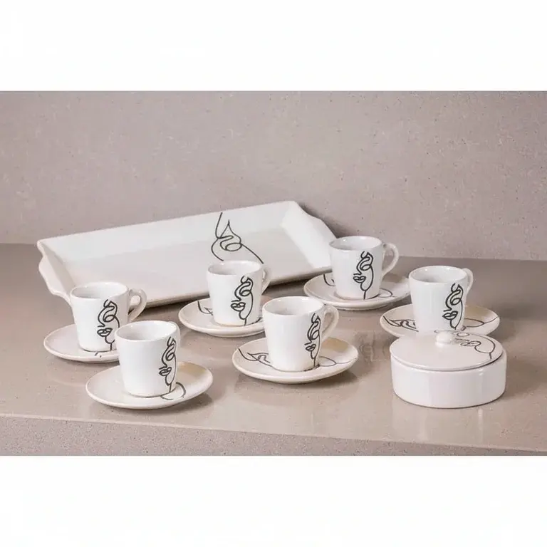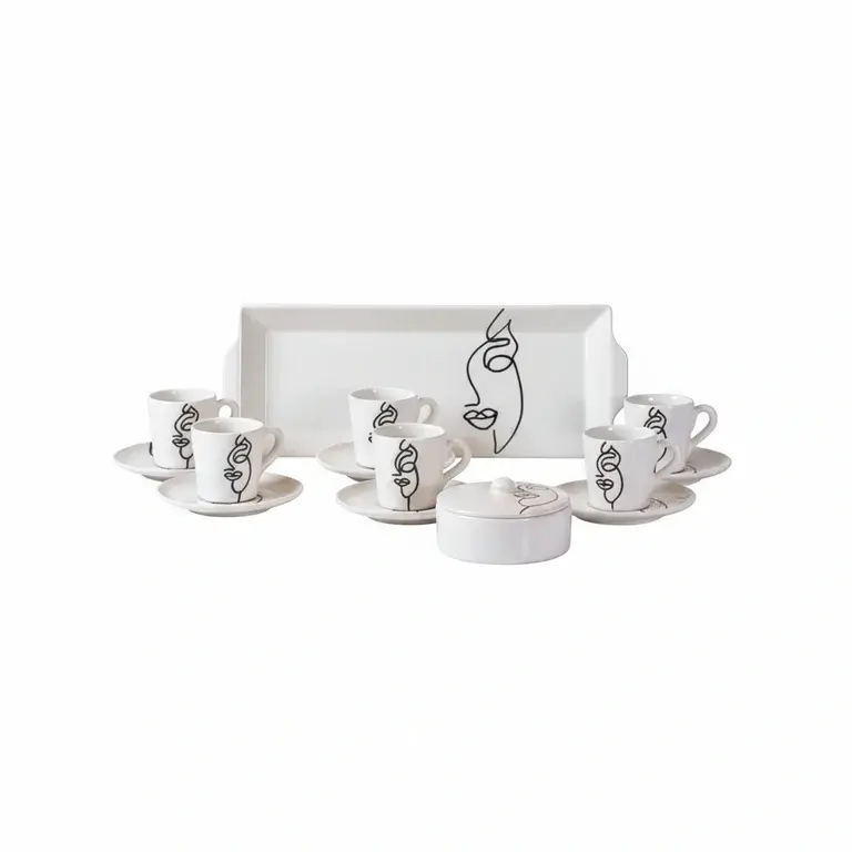 This complete set includes everything needed for elegant coffee service: 6 ceramic coffee cups, 6 matching saucers, one rectangular serving tray measuring 14.5cm by 37cm, one candy dish with a diameter of 10cm, and a matching lid. Each piece features the distinctive Face Art design that adds artistic flair to your daily routine.