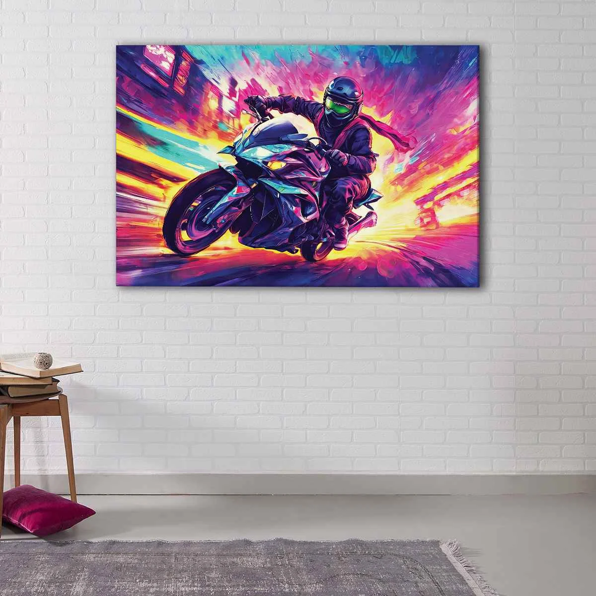 Our rainbow motorcycle wall art is available in 1 panel to 3 panel and 5 panel canvas options, as well as in various sizes, from small to oversized canvas prints. Whether you're looking to decorate your living room, hallway, kids room, or dining room, this vibrant art piece will undoubtedly make a statement.