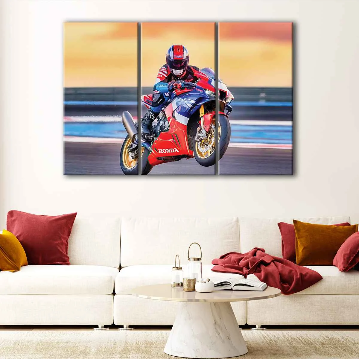 Available in 1, 3, or 5-panel configurations, our Honda CBR wall art is ready to hang with metal saw-tooth hangers, and no additional framing is required. You can choose from a range of sizes, from small to oversized, to fit perfectly in your garage, man cave, or game room. This stunning canvas print is designed to make a bold statement in any setting.