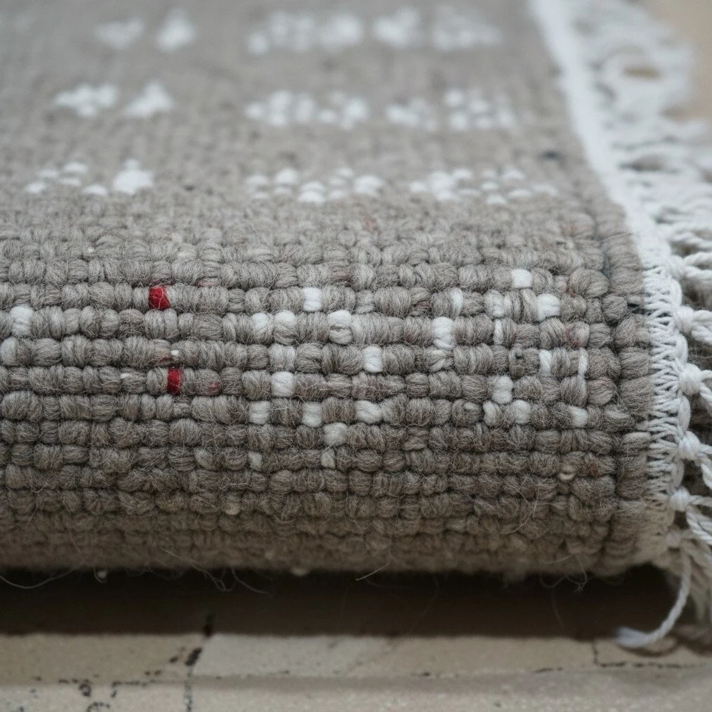 This carpet is expertly woven from natural camel wool, known for its durability, warmth, and softness. The wool fibers provide excellent insulation, keeping your feet cozy during cooler months. The traditional weaving techniques used ensure a sturdy and long-lasting product that maintains its shape and texture over time. The subtle gray hue is derived from natural dyes, enhancing the rug's organic and authentic appeal. Each piece reflects the skilled artistry of El Medina Carpets, offering a touch of handmade charm to your living space.