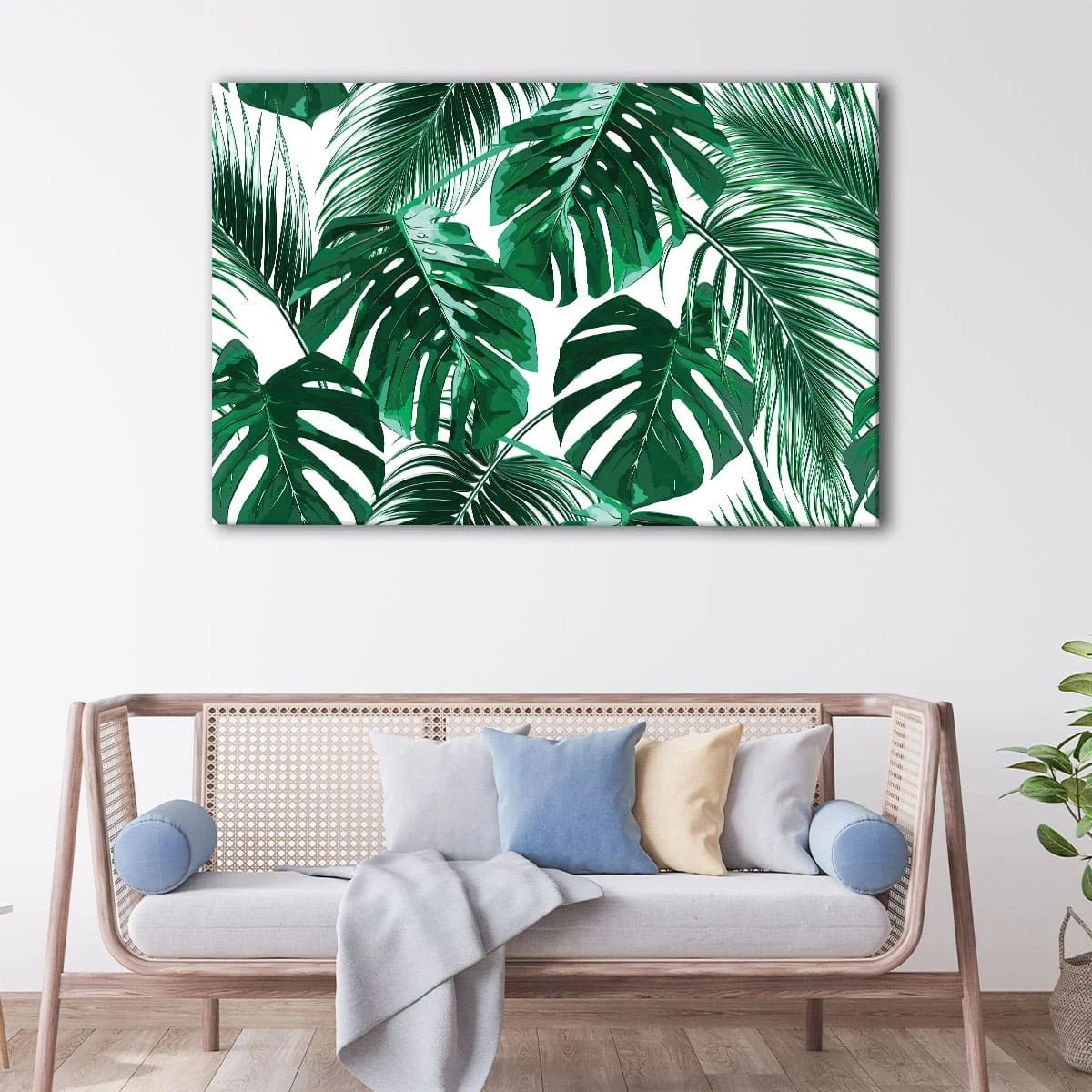 The Monstera Leaves canvas art is a stunning piece of wall art that's ready to hang with metal saw-tooth hangers. Our expert craftsman has carefully hand-stretched the canvas over 100% natural wood stretcher bars to ensure a high-quality finish. We combine premium poly-cotton canvas with pigment-archival inks to produce high-definition prints with vivid colors that will last for over 100 years.