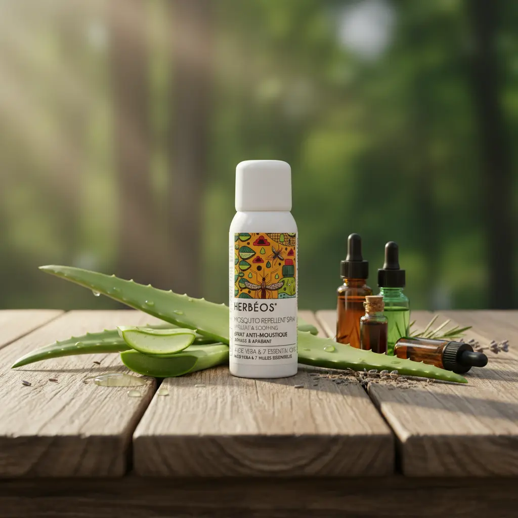 Herbéos Mosquito Repellent Soothing Body Spray provides effective, natural protection against mosquitoes and other insects. Formulated with 7 essential oils and aloe vera, this spray creates a protective barrier that repels mosquitoes while being gentle on your skin. The convenient 100ml spray bottle makes application easy for personal use during outdoor activities, travel, or daily protection.