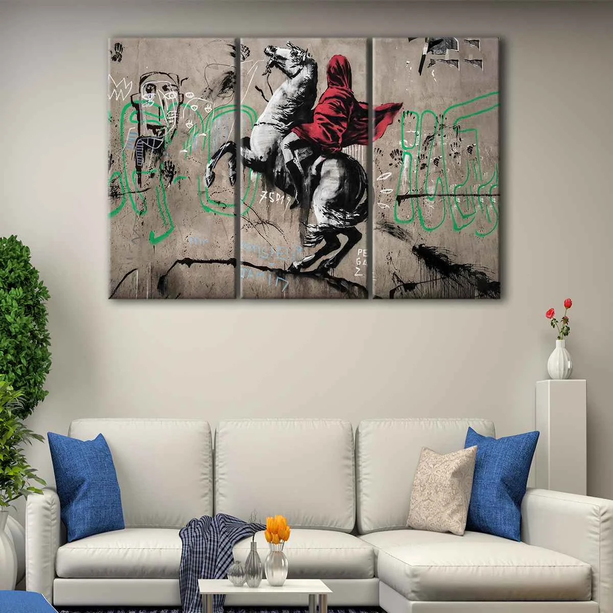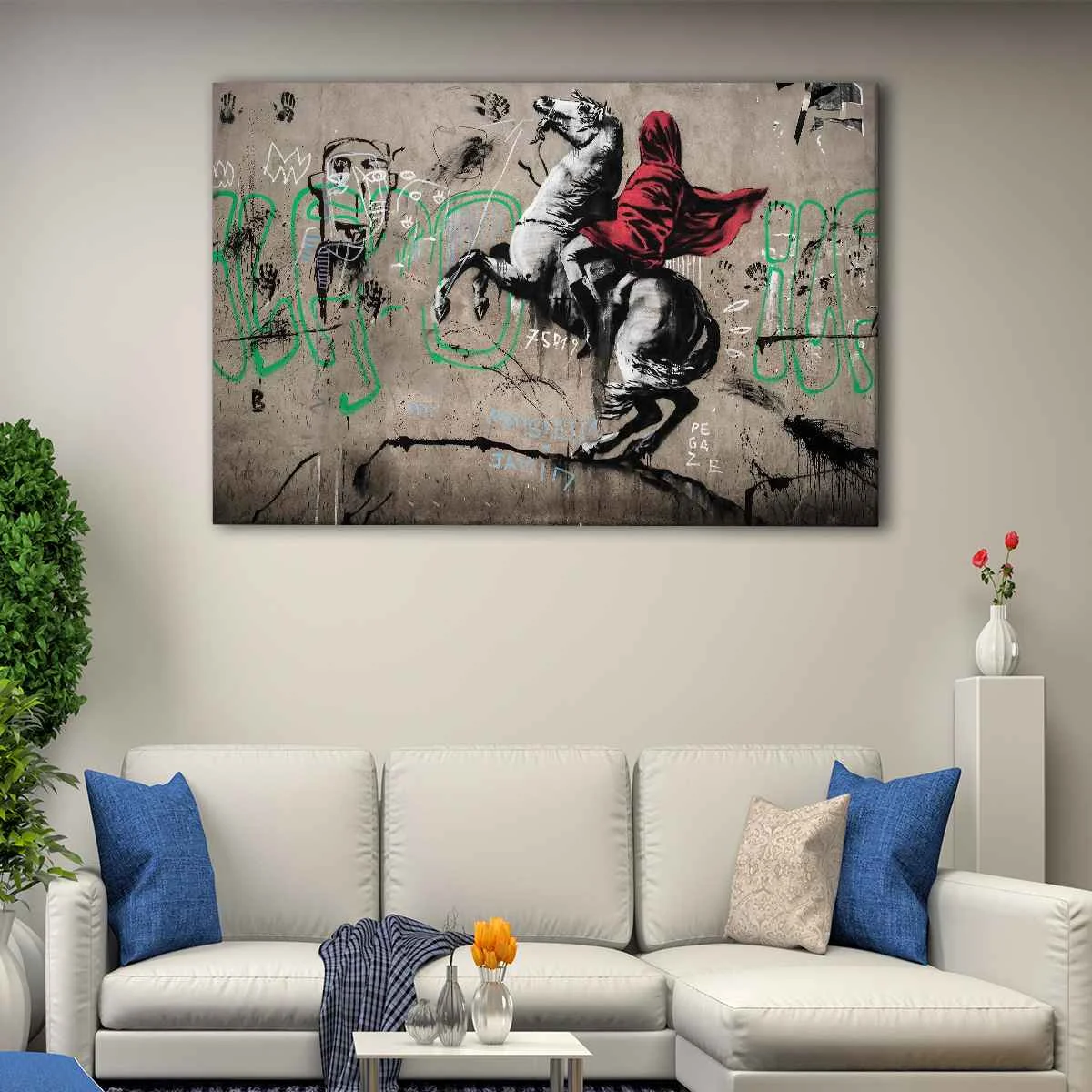 This item is available for sale at tourathy.com. Don't miss the opportunity to own a piece of street art history. Visit our online marketplace today and take home a stunning Banksy Horse Rider Canvas Art.