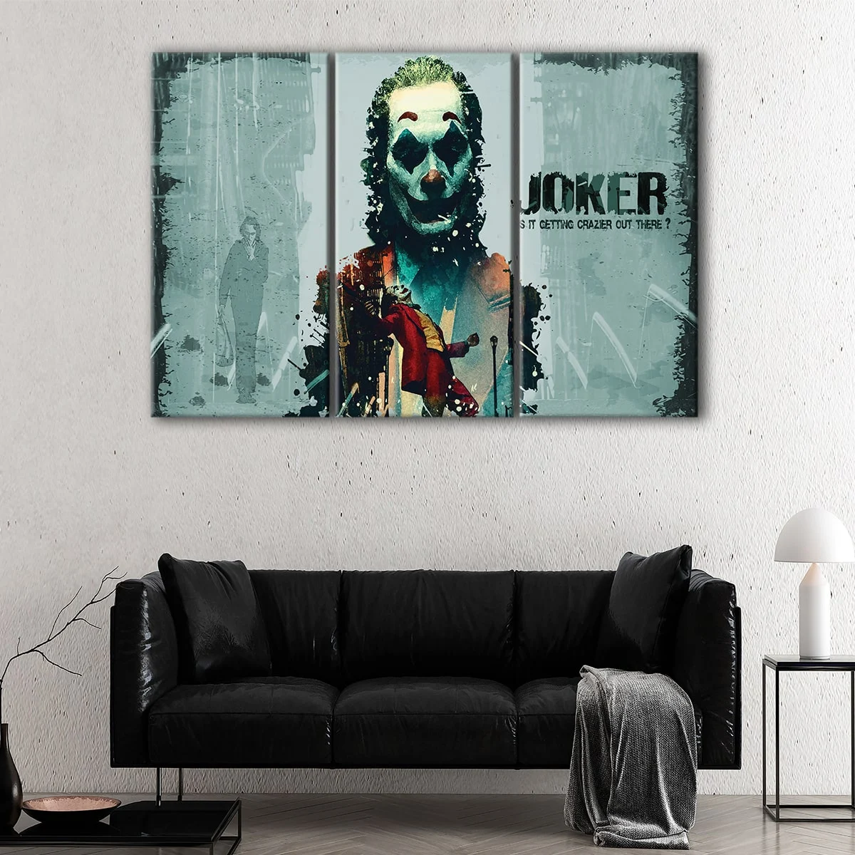 This Joker movie wall art is available in various formats: 1 panel canvas wrap, 3 panels canvas wrap, and many different sizes from small to over-sized canvas print. Perfect for your living room, hallway, kids room, or dining room.