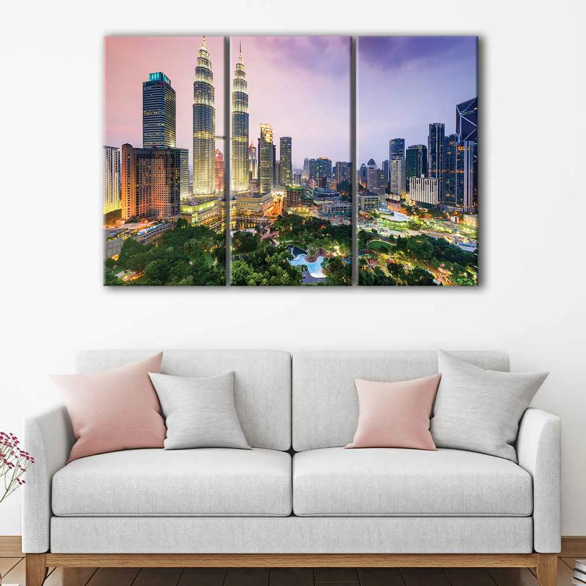 This Kuala Lumpur cityscape artwork is available in 1 panel, 3 panels, or 5 panels, and in various sizes, ranging from small to extra-large, making it a perfect fit for any room: living room, hallway, kids room, or dining room.