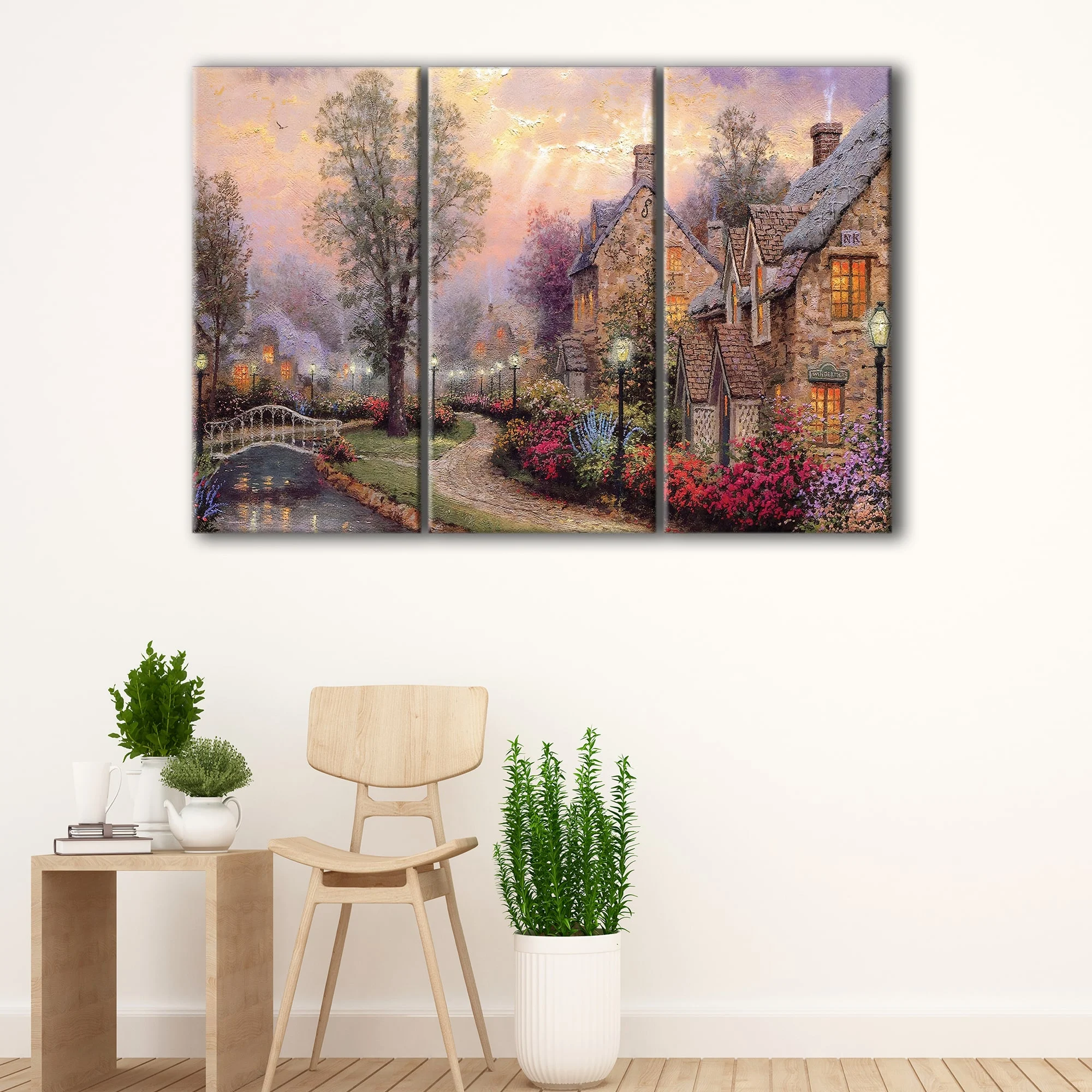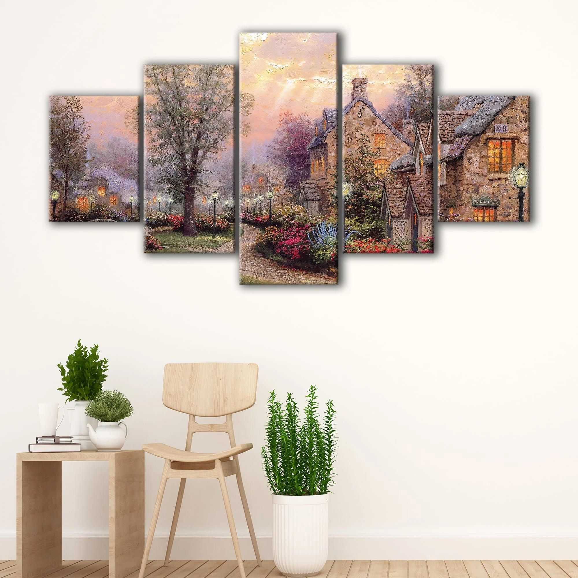 Available in 1 panel, 3 panels, and 5 panels, our Thomas Kinkade wall art is the perfect addition to any room in your home, from cozy bedrooms to spacious living rooms.