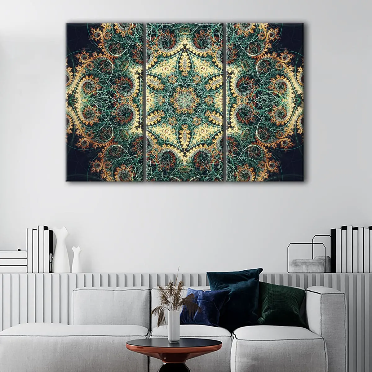This stunning green mandala wall art is available in various configurations: 1-panel, 3-panel, or 5-panel formats, as well as a range of sizes, including small to oversized canvas prints, ensuring the perfect fit for your living room, hallway, or dining room.