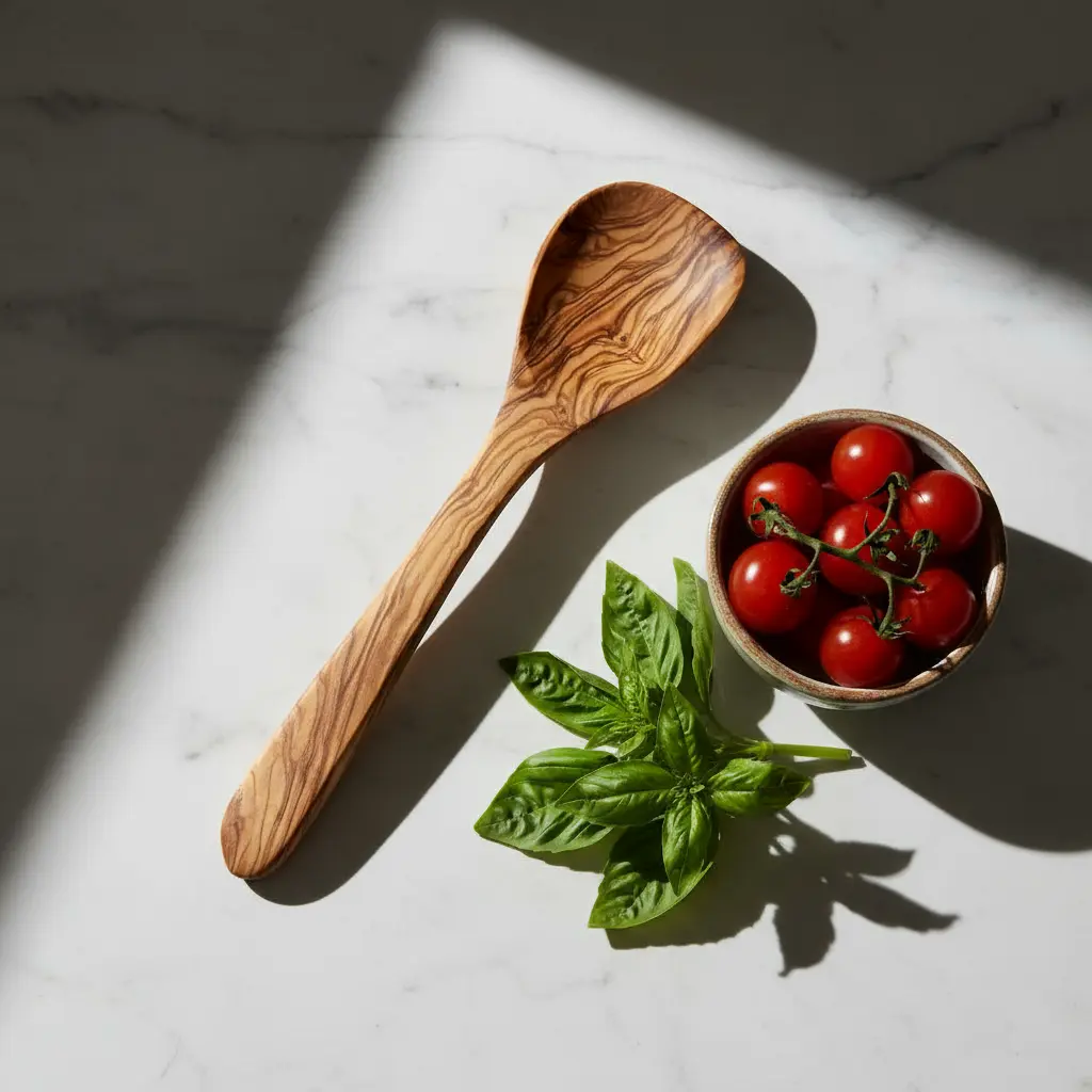 Discover this unique handmade wooden cooking spoon, expertly crafted from natural olive wood. Each spoon showcases the beautiful, natural grain patterns of olive wood, making every piece one-of-a-kind. The special angled design is specifically engineered to reach every corner of your cookware, ensuring no food gets left behind during cooking preparation.