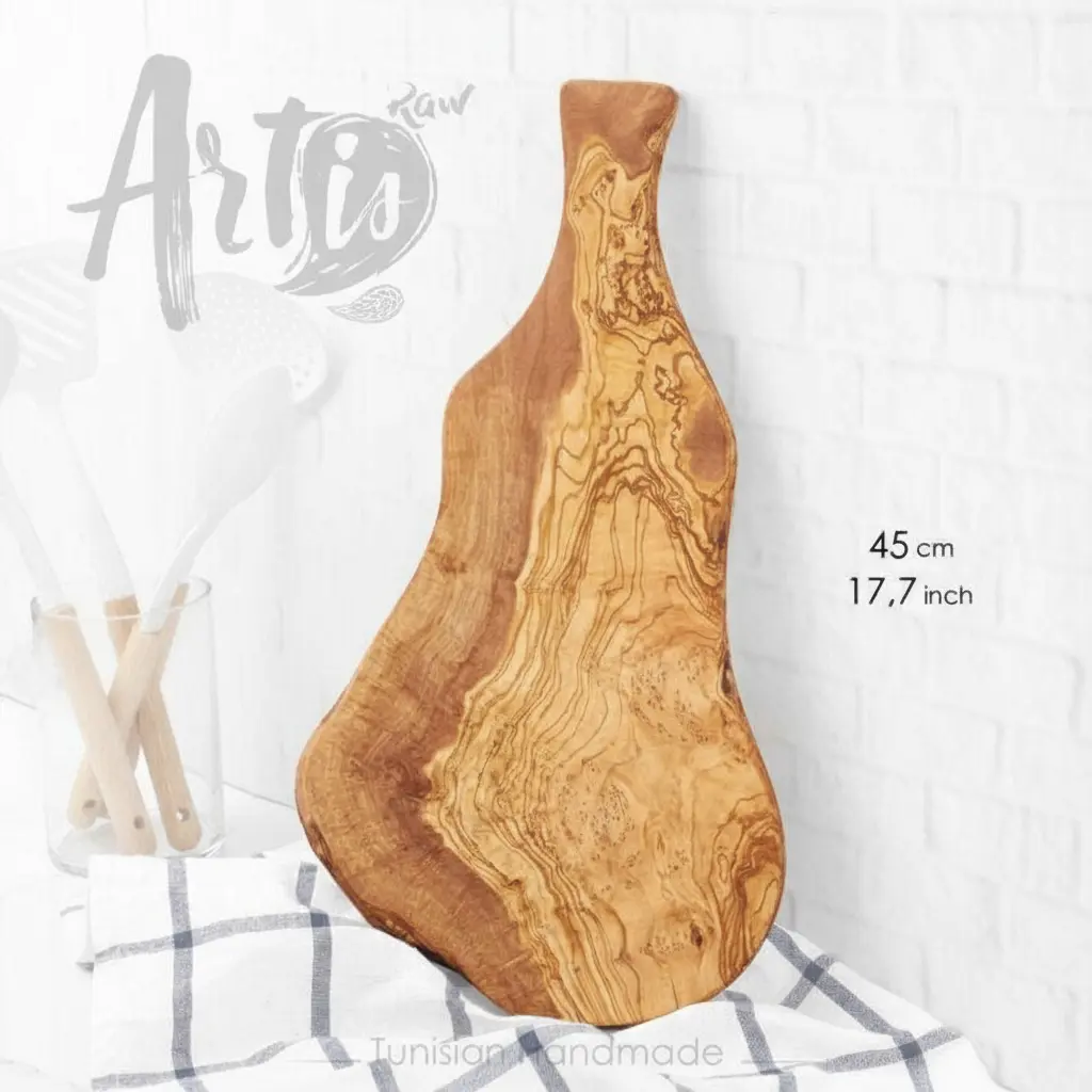 Discover the Artisraw handcrafted olive wood cutting board, a beautiful and durable kitchen essential. This natural wood board is crafted from high-quality olive wood, known for its strength and unique grain patterns. It is designed to be gentle on your knives, helping to maintain their sharpness over time. The board also features natural antibacterial properties, making it a hygienic choice for all your food preparation needs. Perfect for both everyday use and special occasions, this cutting board combines functionality with stunning artisanal design.