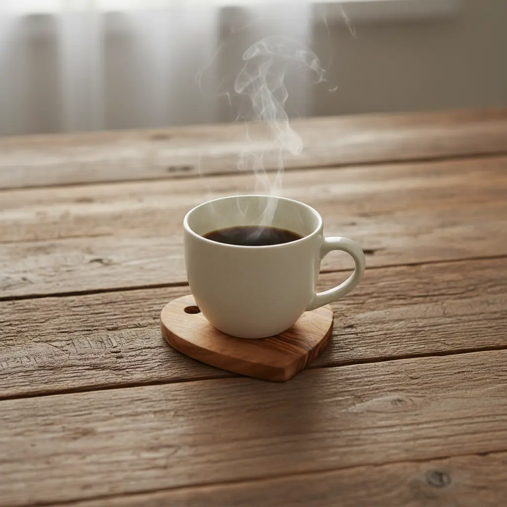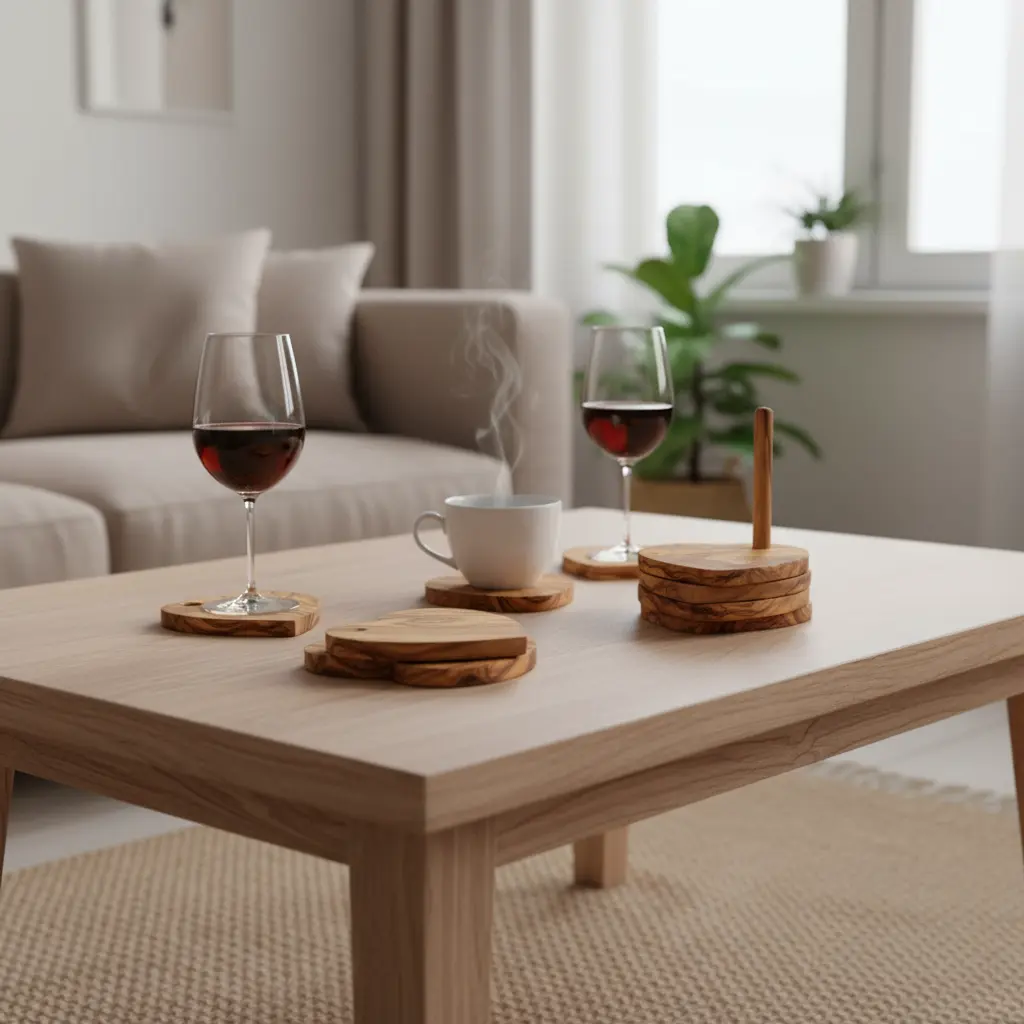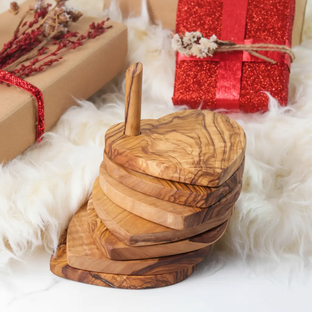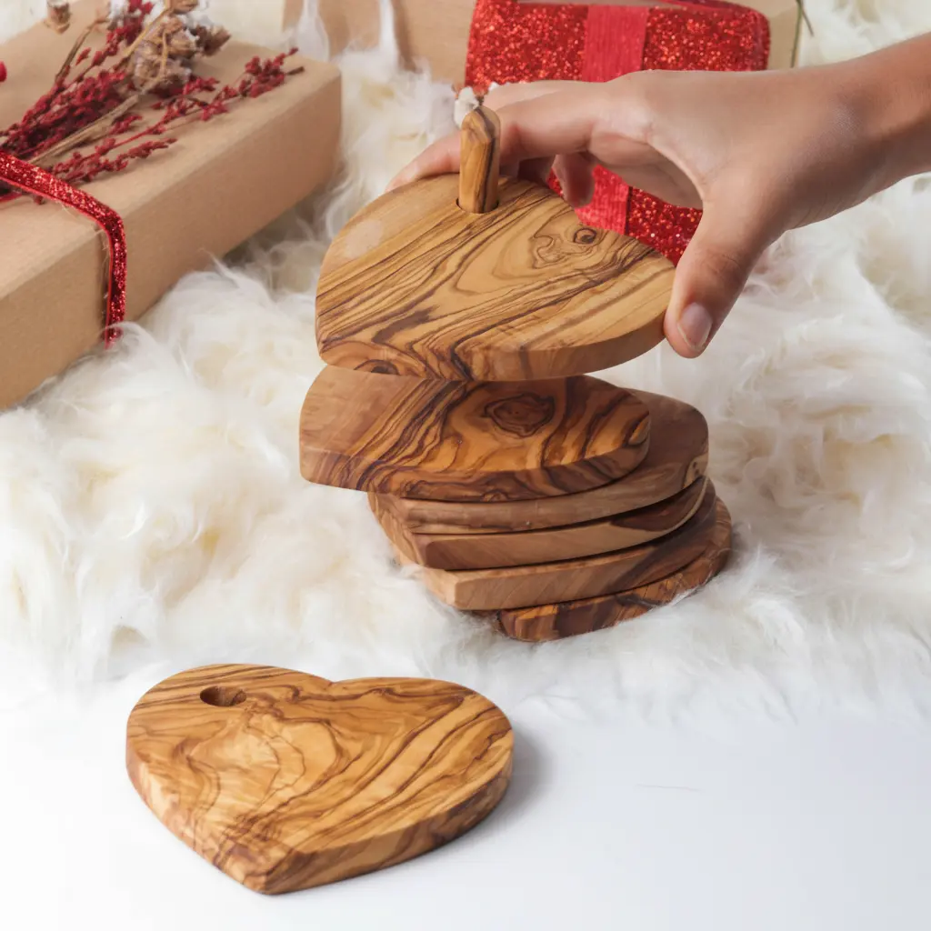 This beautiful home decor set includes 6 unique, heart-shaped coasters and a matching holder, all crafted from solid olive wood. Each piece showcases the natural grain and warm tones of olive wood, making every coaster one-of-a-kind. The set measures approximately 8.5 cm (3.34 inches) per coaster, perfectly sized for standard glasses and mugs while making a charming statement on any table.