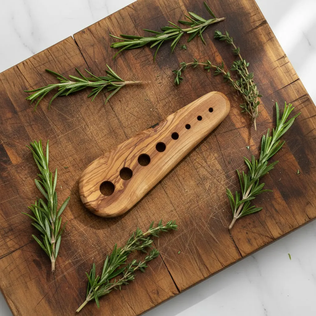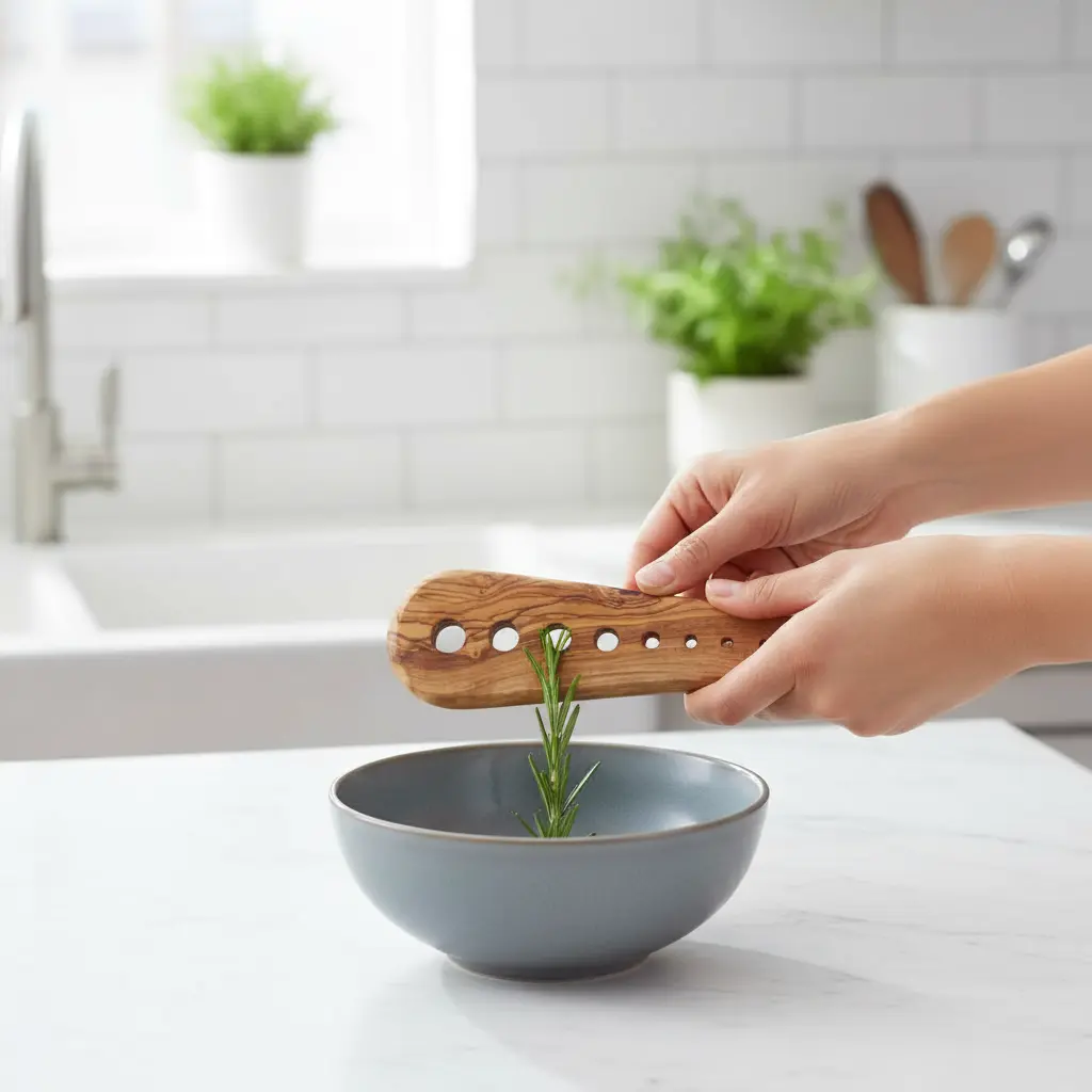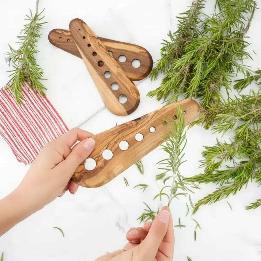 The ergonomic design of the herb stripper fits comfortably in your hand, allowing for smooth, efficient herb preparation. It works seamlessly with a variety of fresh herbs like rosemary, thyme, and oregano, saving you time and effort in the kitchen. The natural properties of olive wood make it resistant to absorbing odors and moisture, ensuring long-lasting hygiene and performance. This tool eliminates the need for tedious hand-stripping or using less effective kitchen knives, streamlining your food preparation process and enhancing your overall cooking experience.