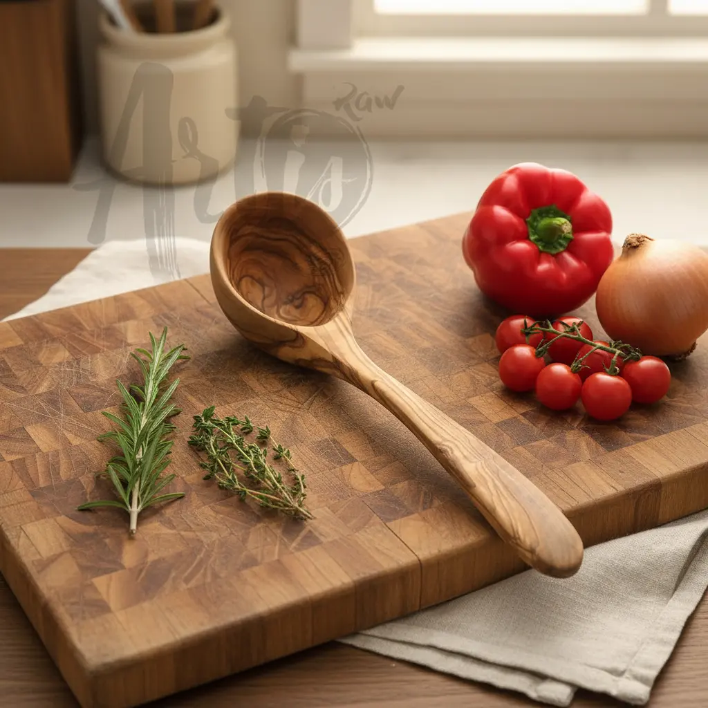 Discover the Artisraw Olive Wood Ladle Spoon, a unique and functional kitchenware item meticulously handmade from solid olive wood. This serving spoon is not only a tool but a piece of art, designed to elevate your dining experience. The natural grain of the olive wood ensures that no two spoons are exactly alike, giving you a one-of-a-kind utensil. Its durable construction and naturally antibacterial properties make it a hygienic choice for everyday use, perfect for serving a variety of dishes from soups to salads.