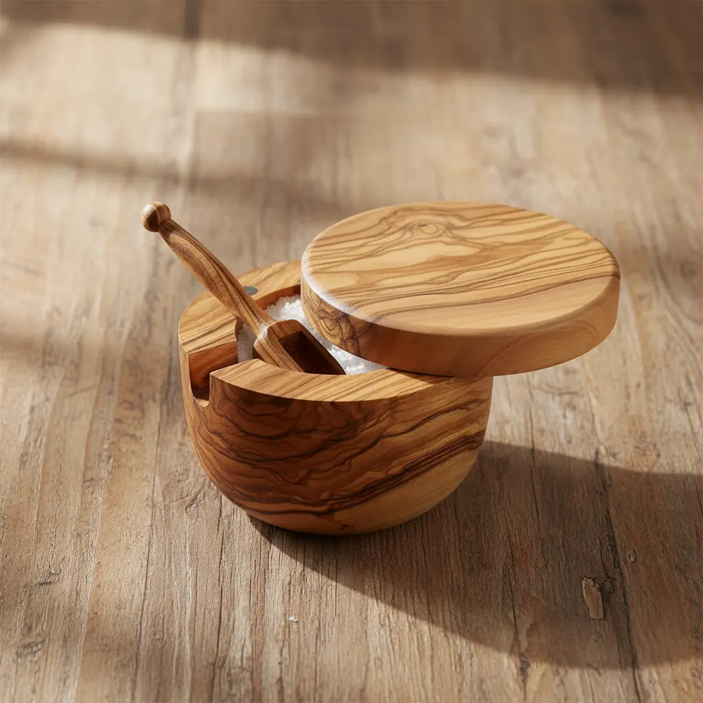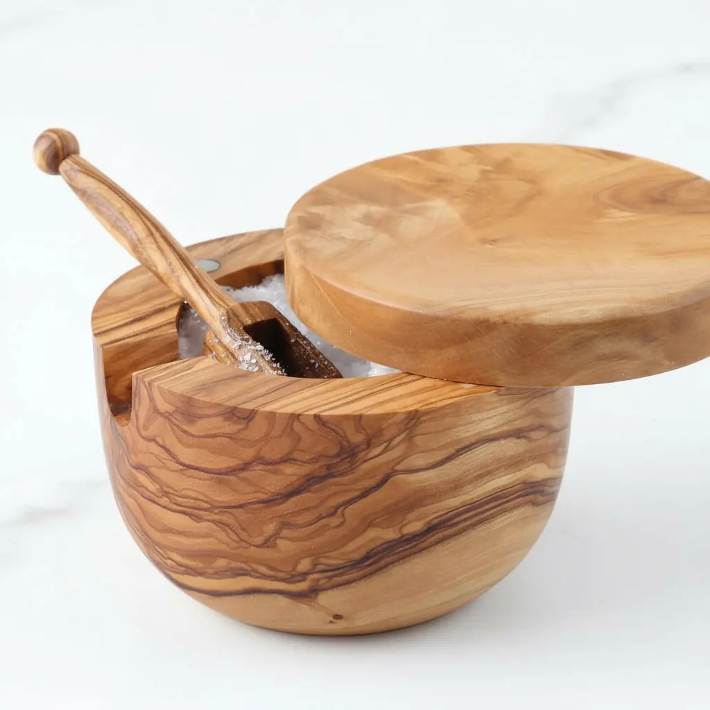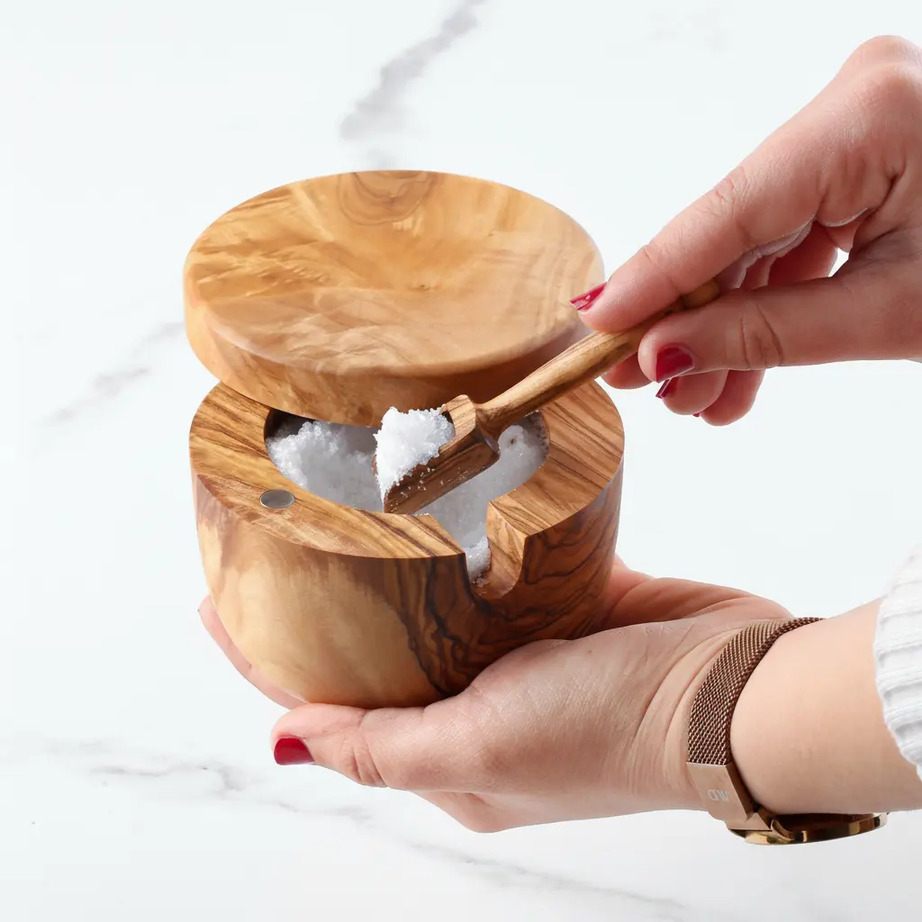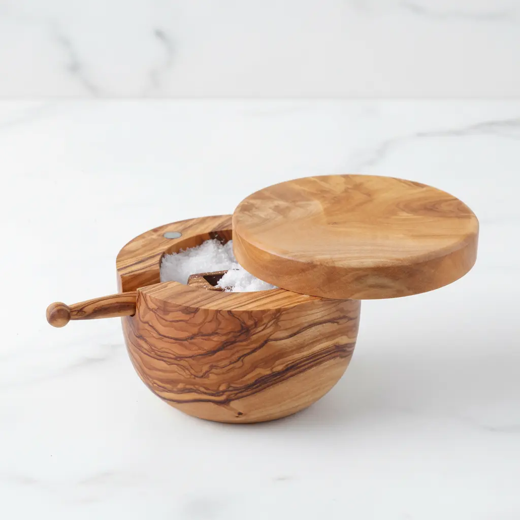 Olive Wood Salt Cellar – Spoon & Swivel Lid