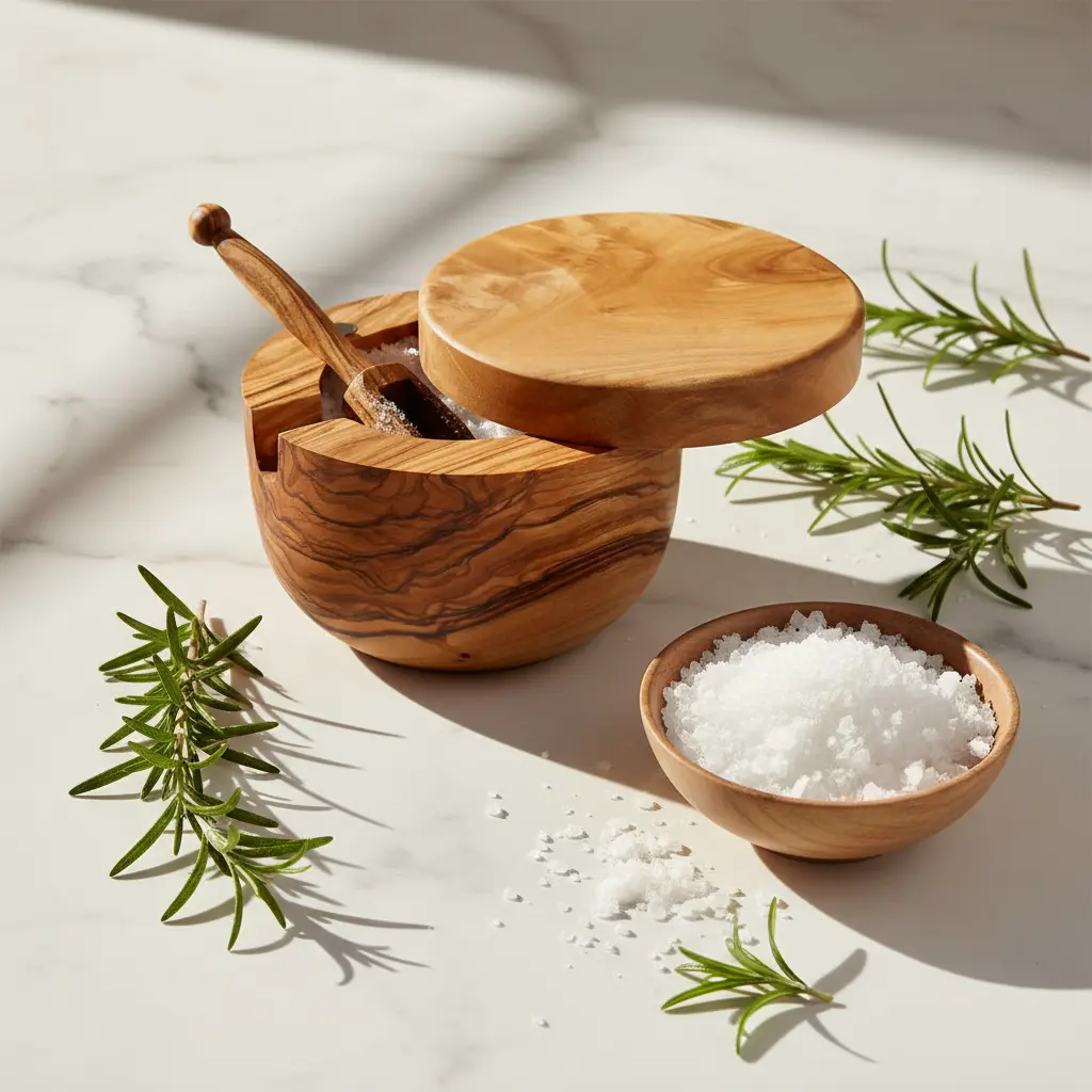 This beautiful salt cellar set from Artisraw is meticulously handcrafted from natural olive wood, showcasing unique grain patterns and a warm, rustic aesthetic. The set includes a swivel-lid cellar and a perfectly matching spoon, designed to complement any kitchen decor. The natural material ensures each piece is one-of-a-kind, bringing organic elegance and artisanal quality to your countertop.