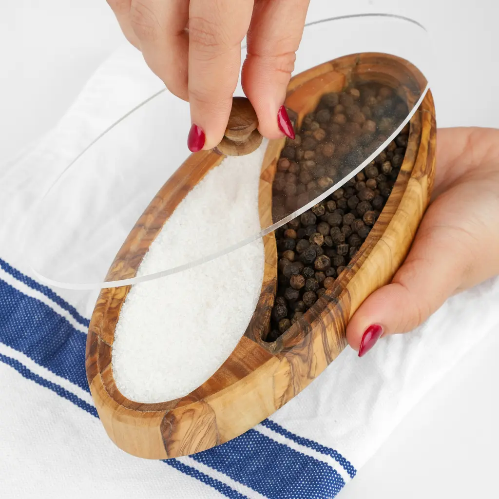 The salt cellar features a clear plexiglass lid that allows you to easily monitor your salt levels while keeping contents dry and protected from moisture. The transparent design ensures your salt remains accessible while maintaining a sleek, modern look that complements the wooden base. This practical feature helps preserve the quality of your salt and prevents clumping.