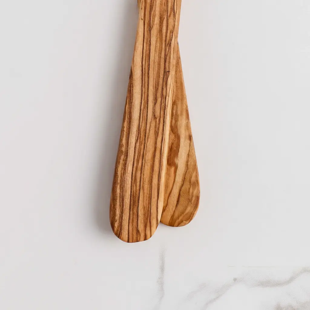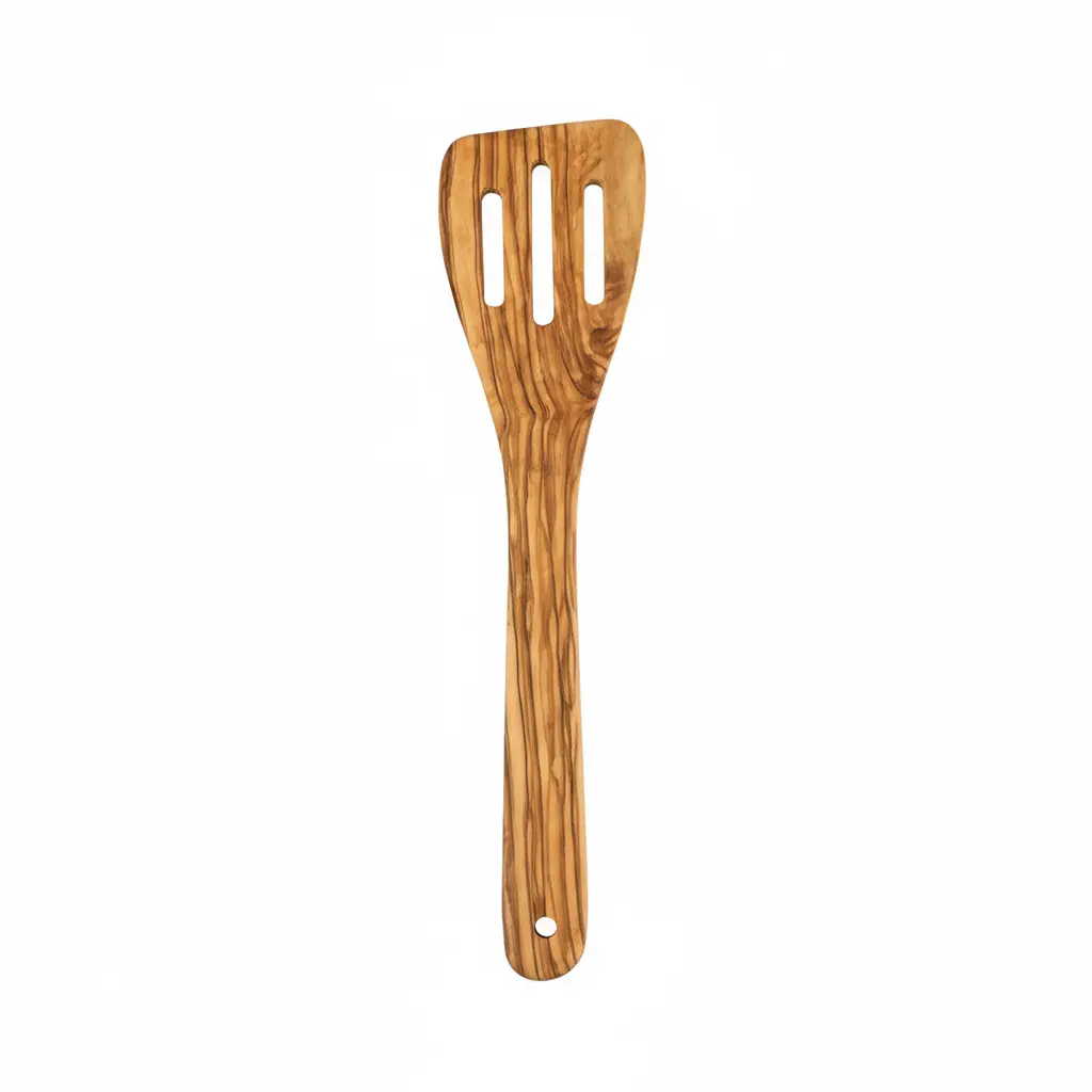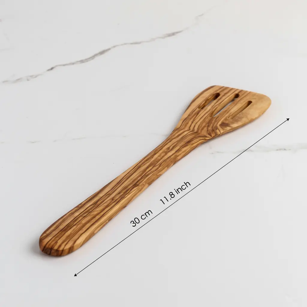 This beautiful slotted spatula is handmade from solid olive wood, combining artisanal craftsmanship with practical kitchen function. Each piece showcases the natural grain and character of olive wood, making every spatula unique. The durable construction ensures this kitchen tool will withstand daily use while maintaining its elegant appearance. Crafted with attention to detail, this spatula represents the perfect blend of traditional woodworking techniques and modern kitchen needs.