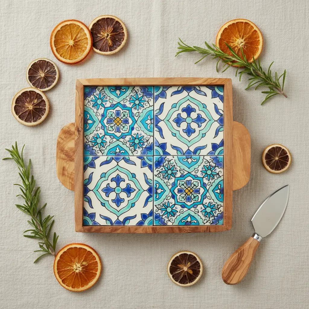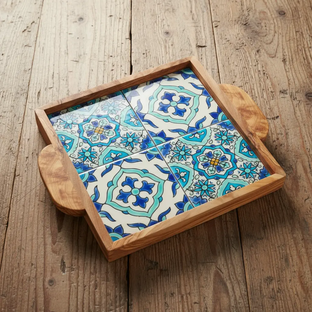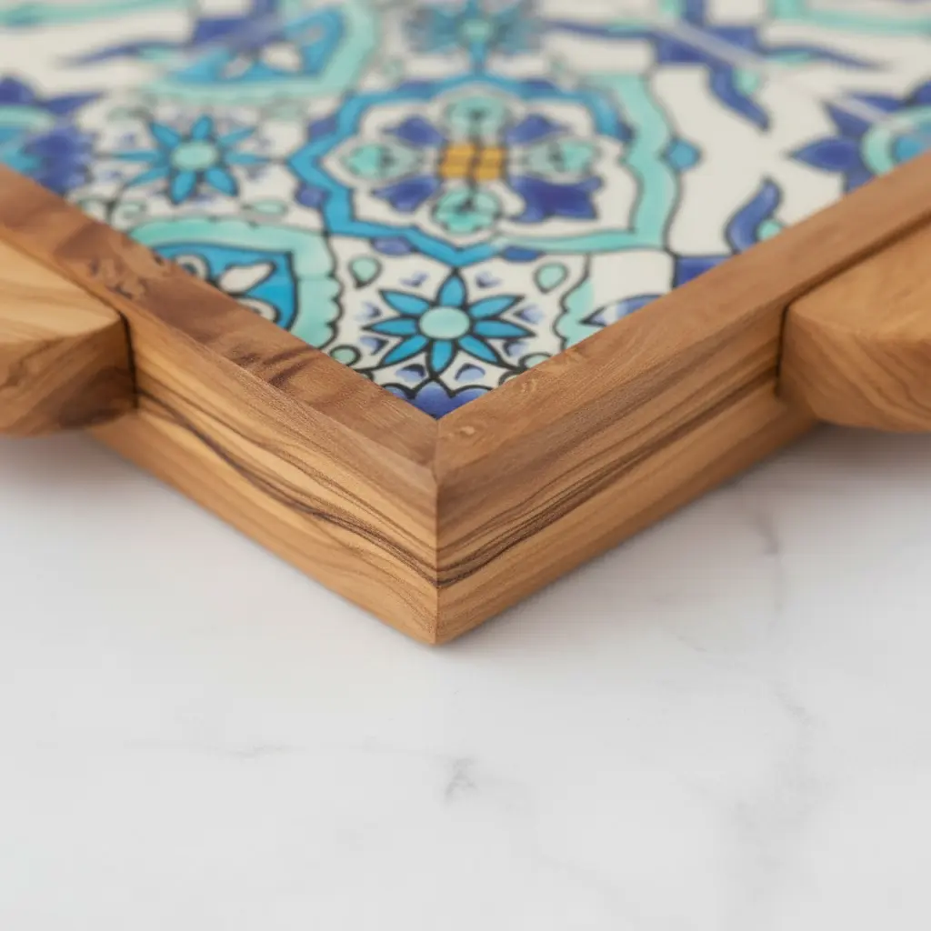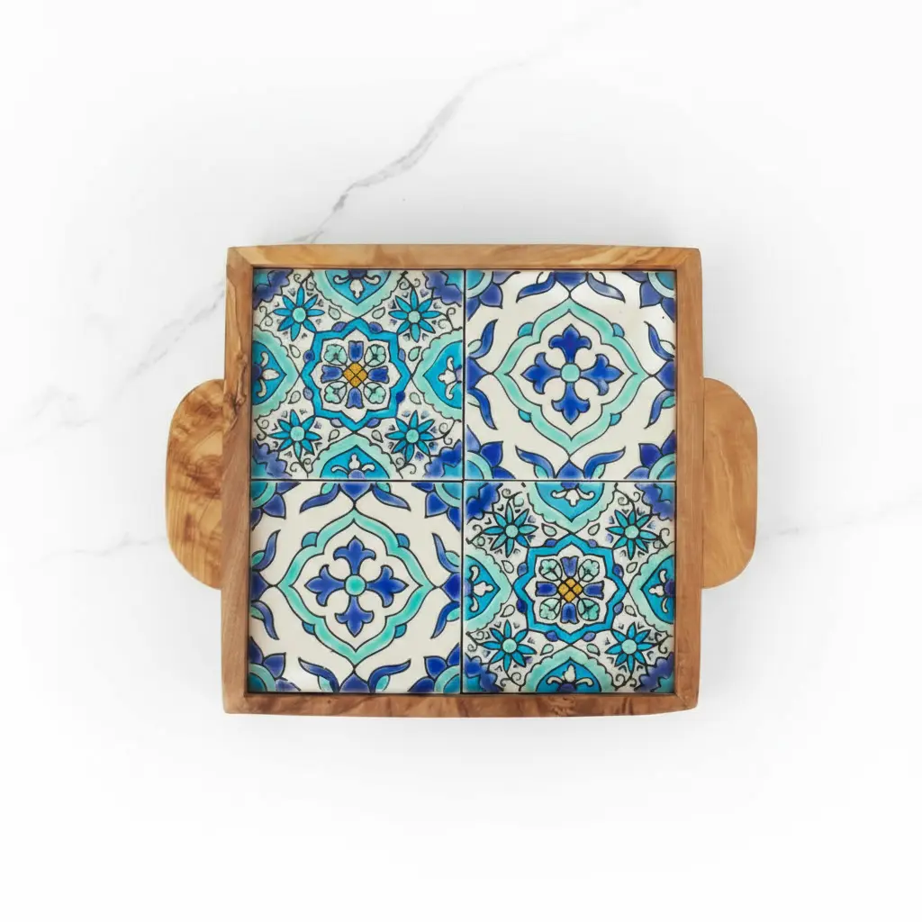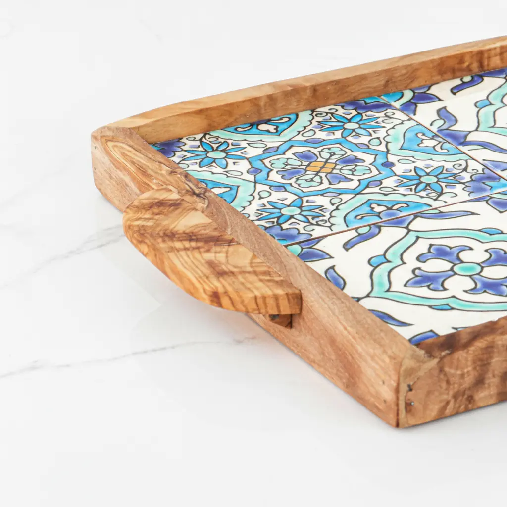 Olive Wood Tray with Hand-painted Ceramic Tiles