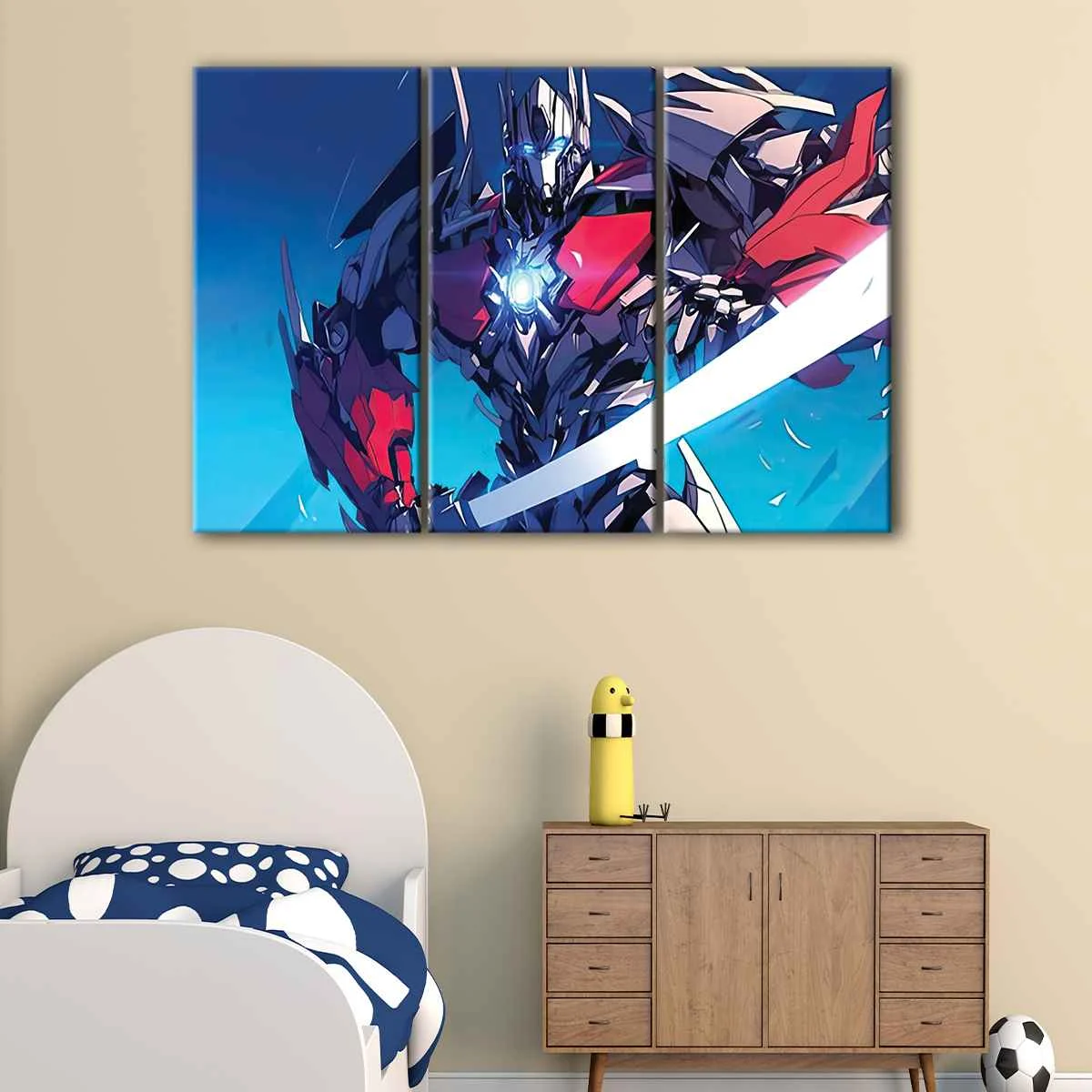 The Optimus Prime Canvas Art is available in various sizes to fit your unique space, from small to oversized. Choose from our range of premium canvas wraps, including 1-panel, 3-panel, and 5-panel options, ensuring that you find the perfect fit for your living room, hallway, kids' room, or dining room.
