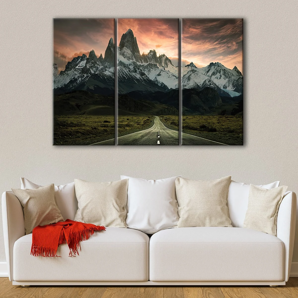This captivating Patagonia mountain wall art is available in multiple configurations: a single 1-panel piece, or grouped in 3 panels or 5 panels. We also offer a wide range of sizes, from small to oversized prints, allowing you to find the perfect fit for your living room, hallway, kids room, or dining room.