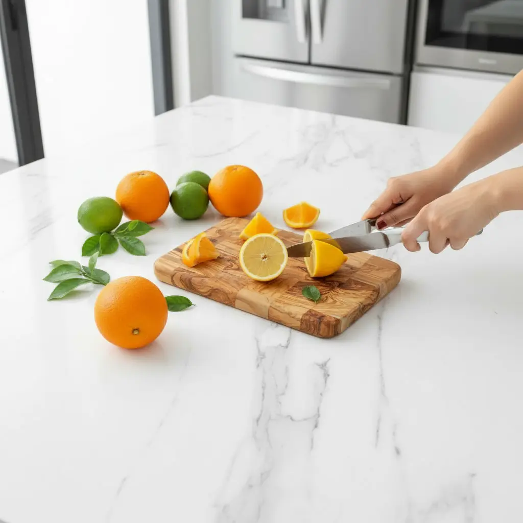 Experience unparalleled versatility in your culinary tasks with this multi-purpose cutting board. The generous rectangular surface provides ample space for all your food preparation needs, from slicing citrus fruits like lemons and oranges to dicing fresh produce. The board's durable construction ensures it can handle daily kitchen demands while remaining gentle on your countertops. Its reliable performance makes it suitable for both professional chefs and home cooking enthusiasts.