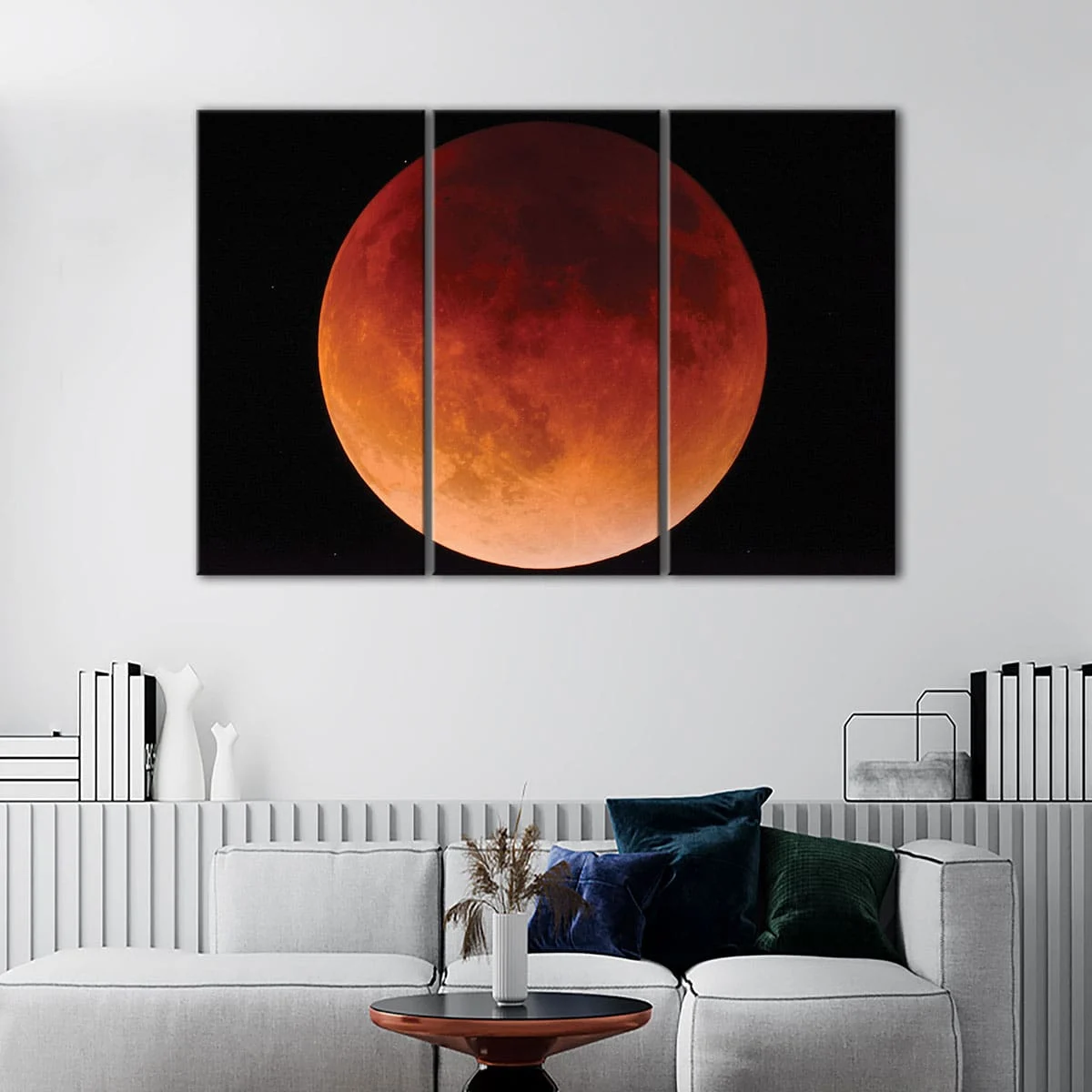 This stunning red moon artwork is designed to perfectly complement any room's decor. Available in 1 panel, 3 panels, or as a canvas print, it fits various spaces such as living rooms, hallways, kids' rooms, or dining rooms. Choose from a range of sizes to suit your interior needs.