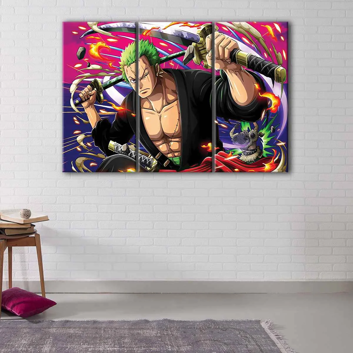 This Roronoa Zoro Attack wall art is suitable for any room in your home, available in a range of sizes from compact to oversized, making it a perfect fit for your living room, hallway, kids room, or dining room.